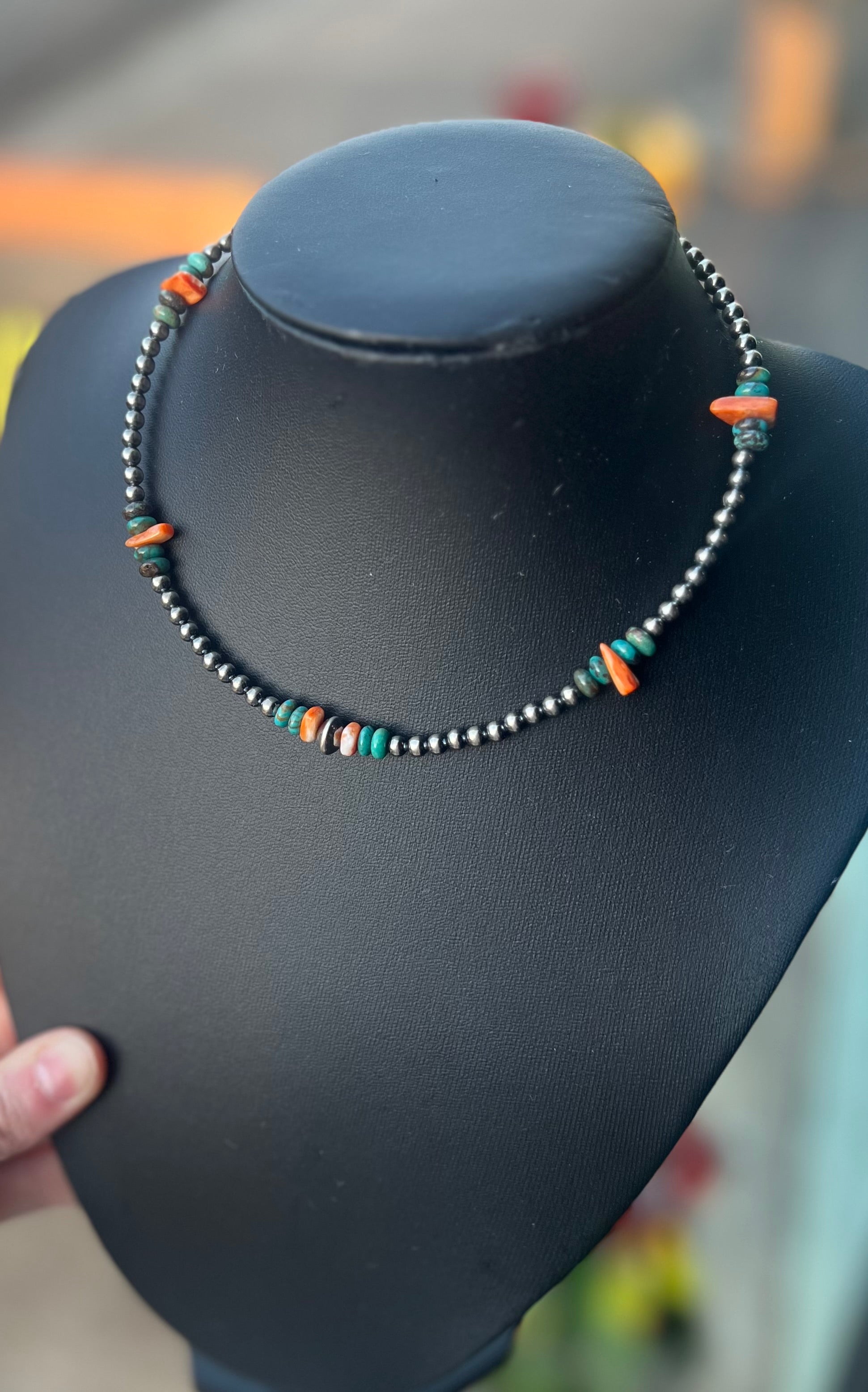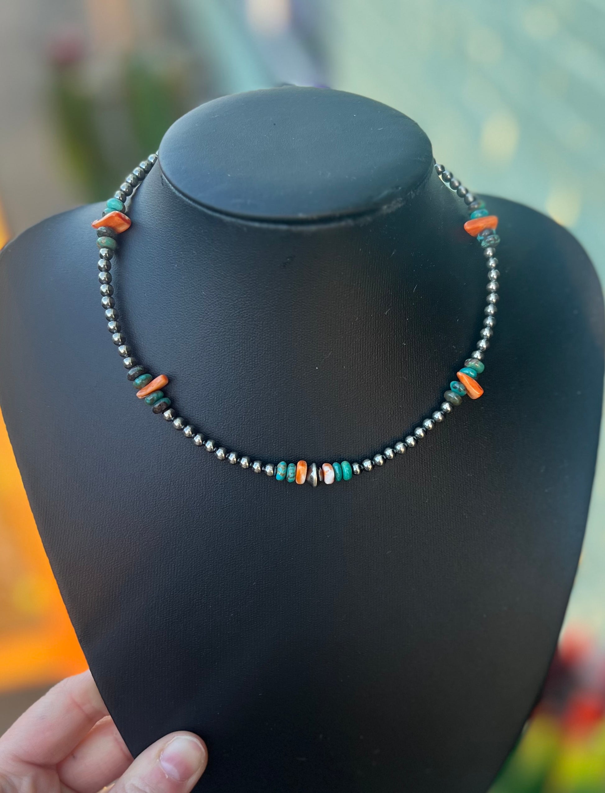 14-Inch Spiny Oyster & Turquoise Necklace with Sterling Silver Pearls