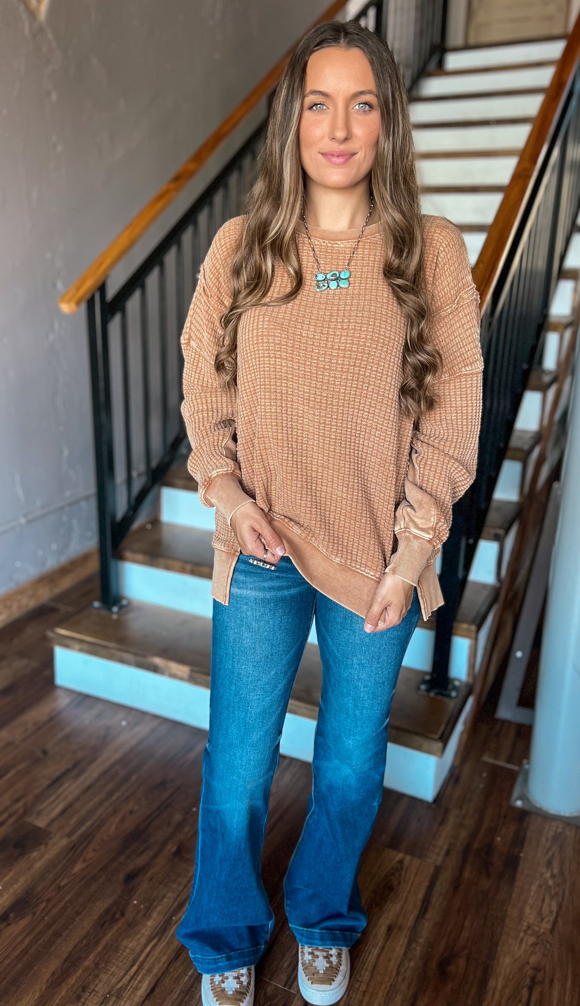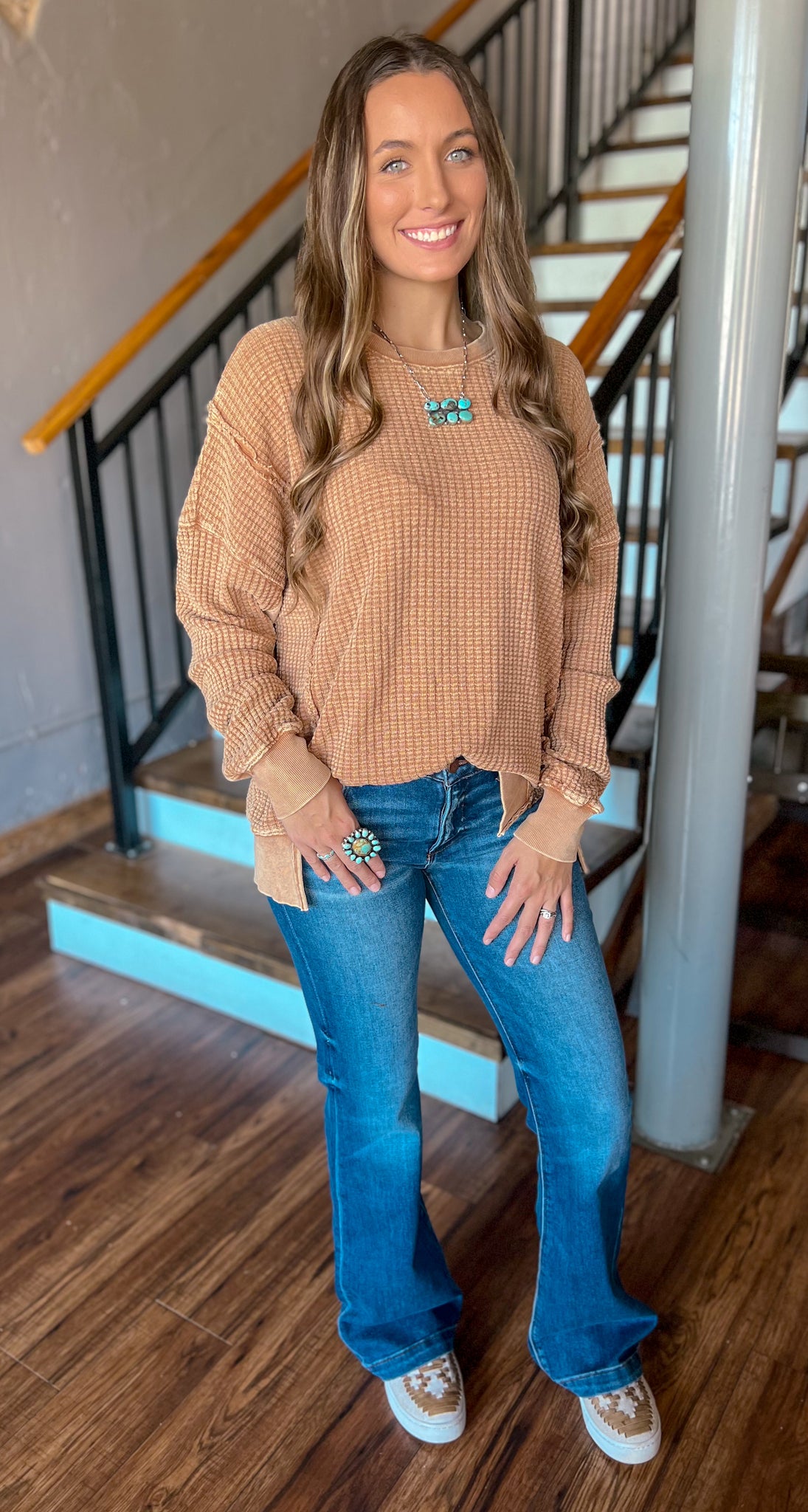 Stay warm and stylish with our Ash Almond Top. The mineral wash gives it a unique look while the thermal material keeps you cozy. The raw edge detail adds a touch of edginess. Perfect for any casual outing.