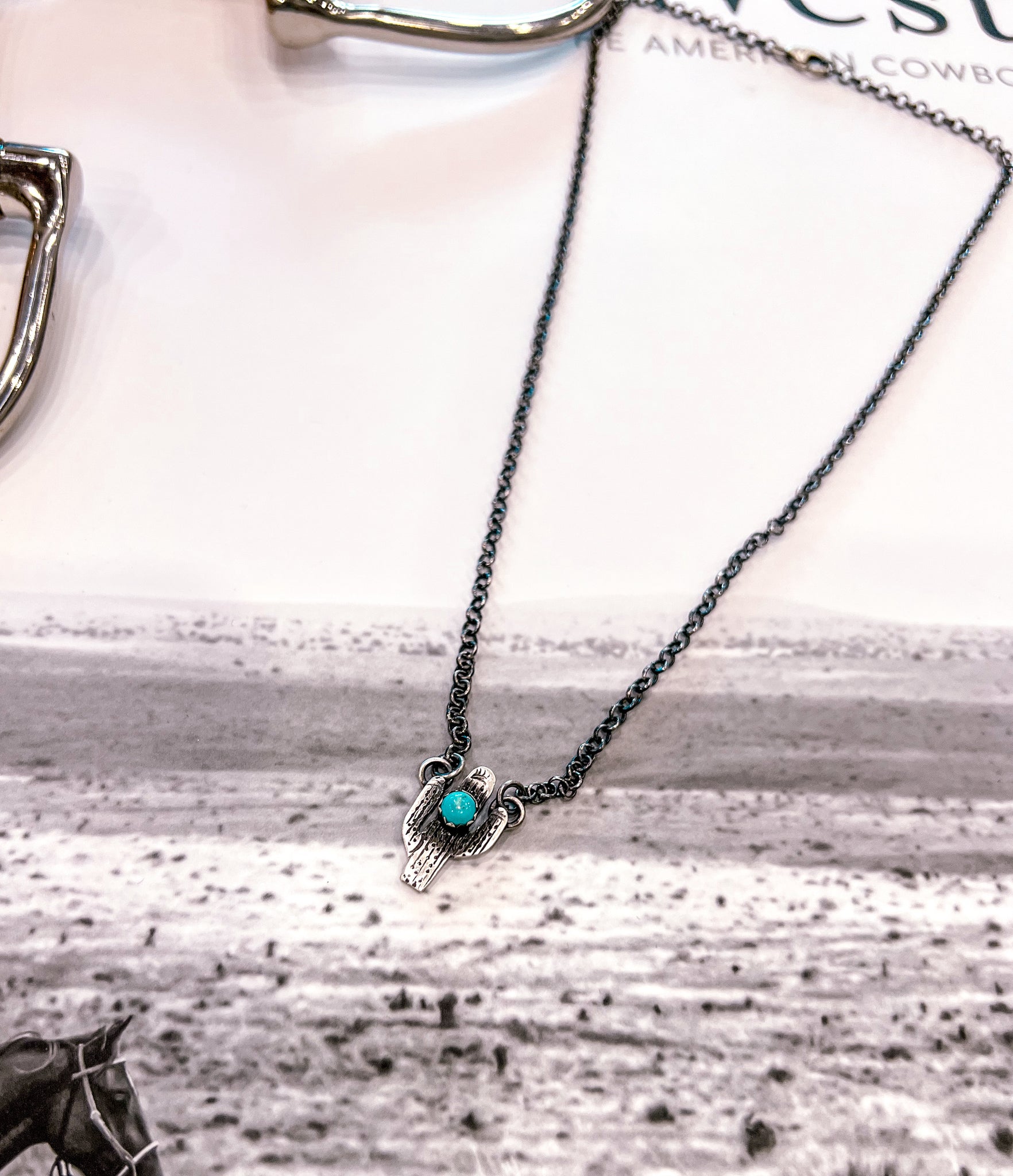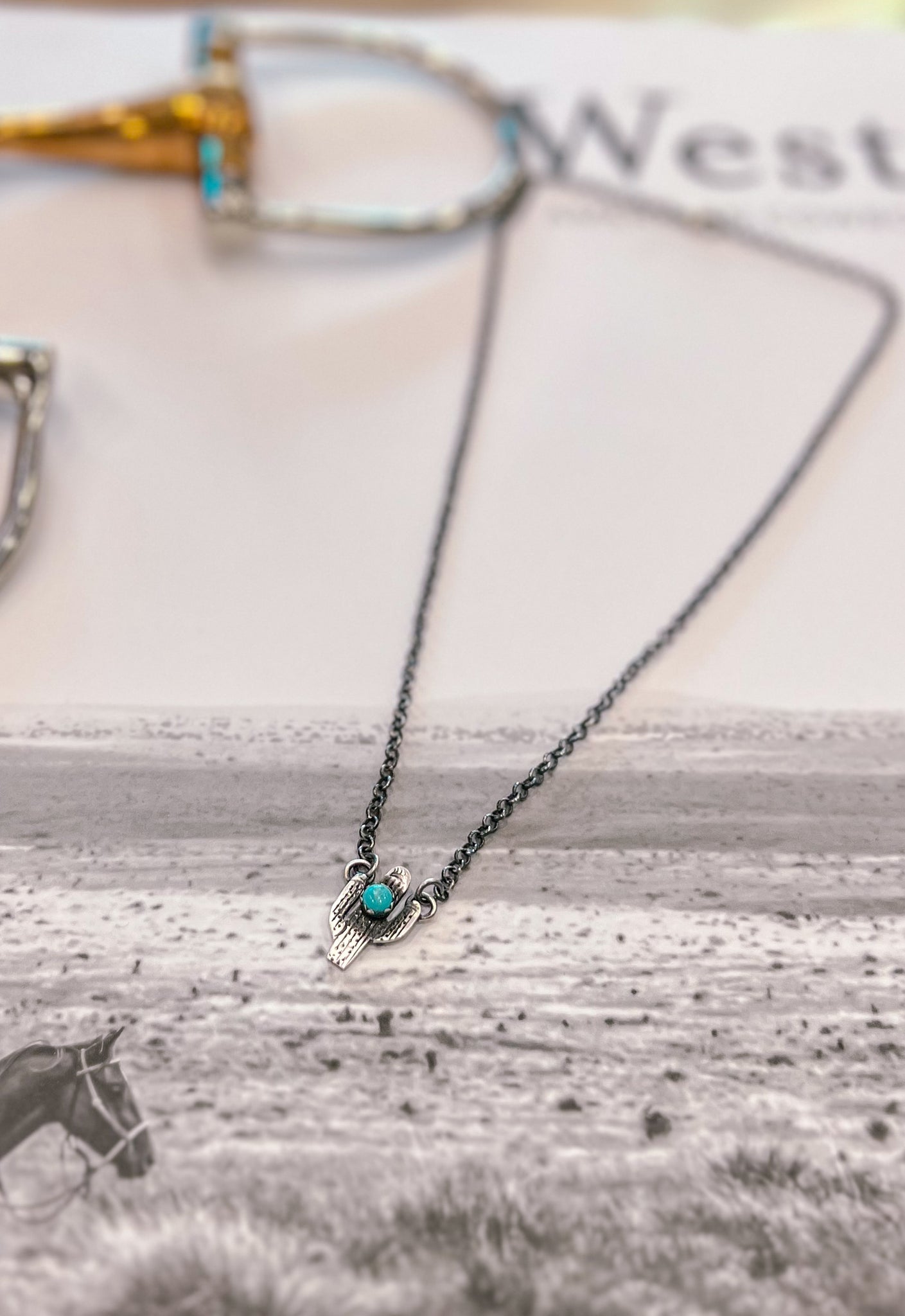 "Bring some desert vibes to your look with this Authentic Turquoise Cactus Necklace. Made with genuine turquoise and sterling silver, this necklace adds a unique touch to any outfit. Perfect for cactus lovers and jewelry enthusiasts alike. (No prickly feelings here!) Limited stock available!"