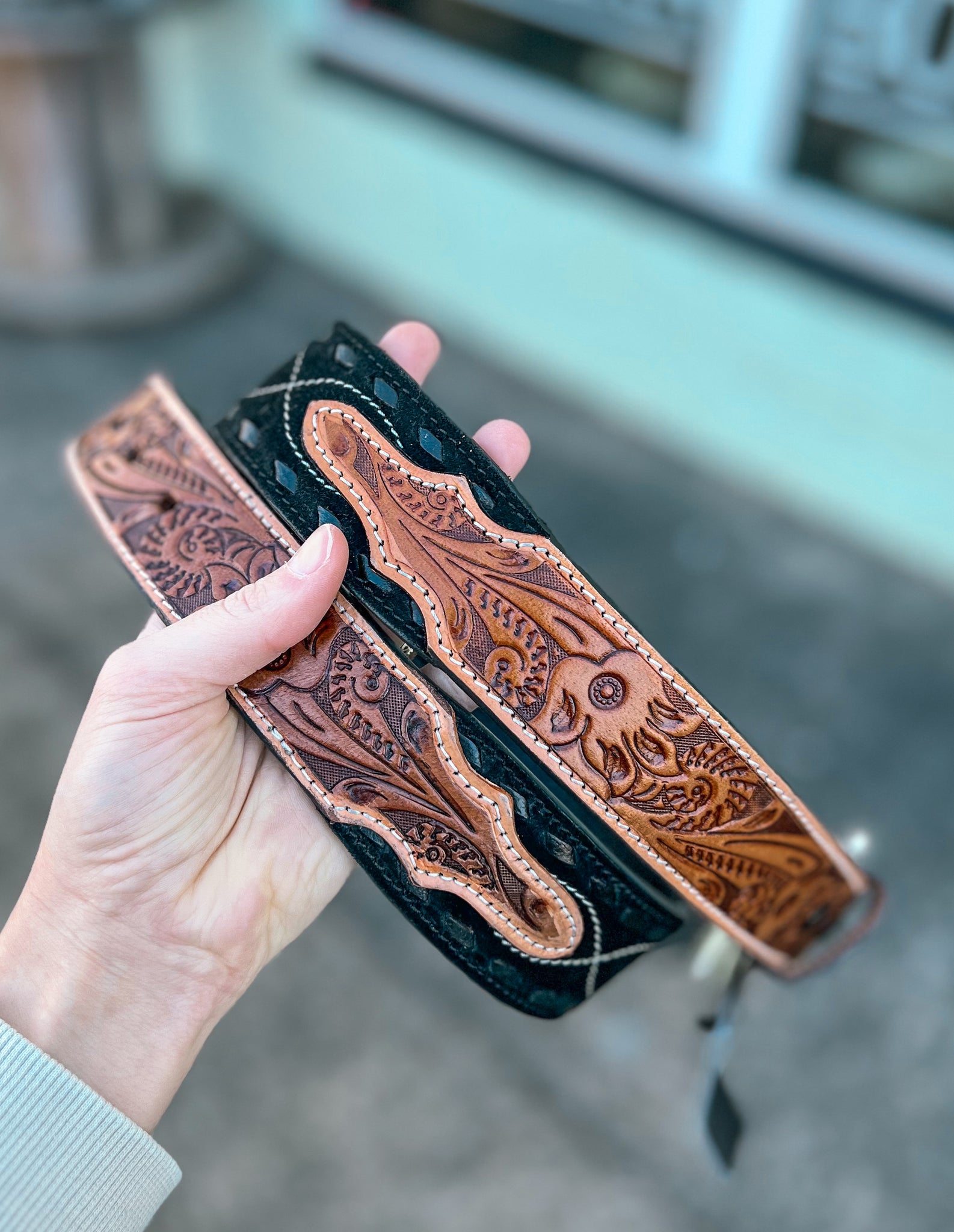 Upgrade your style with our Black Suede Buckstitch Tooled Leather Belt. Made from high-quality suede leather, this belt features intricate buckstitch detail and tooled leather for a unique and stylish look. Elevate any outfit with this versatile and durable accessory.