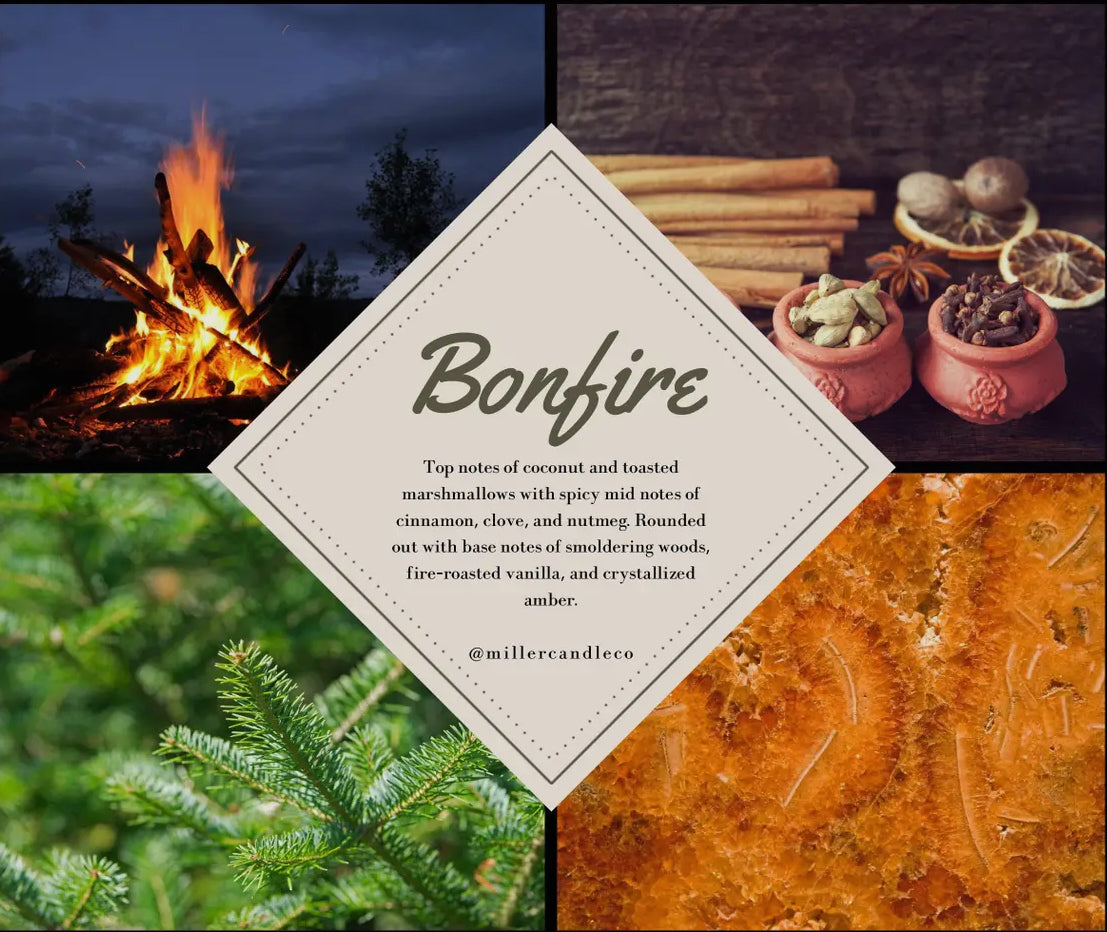 Smoky, sweet, and full of cozy nostalgia - Bonfire captures the warmth of a crackling campfire on a cool night. Notes of toasted marshmallow and creamy coconut blend with spicy cinnamon, clove, and nutmeg for a touch of autumn spice. The scent deepens with base notes of smoldering woods, fire-roasted vanilla, and crystallized amber, creating a comforting aroma that feels like gathering under the stars with friends and stories shared by the fire.