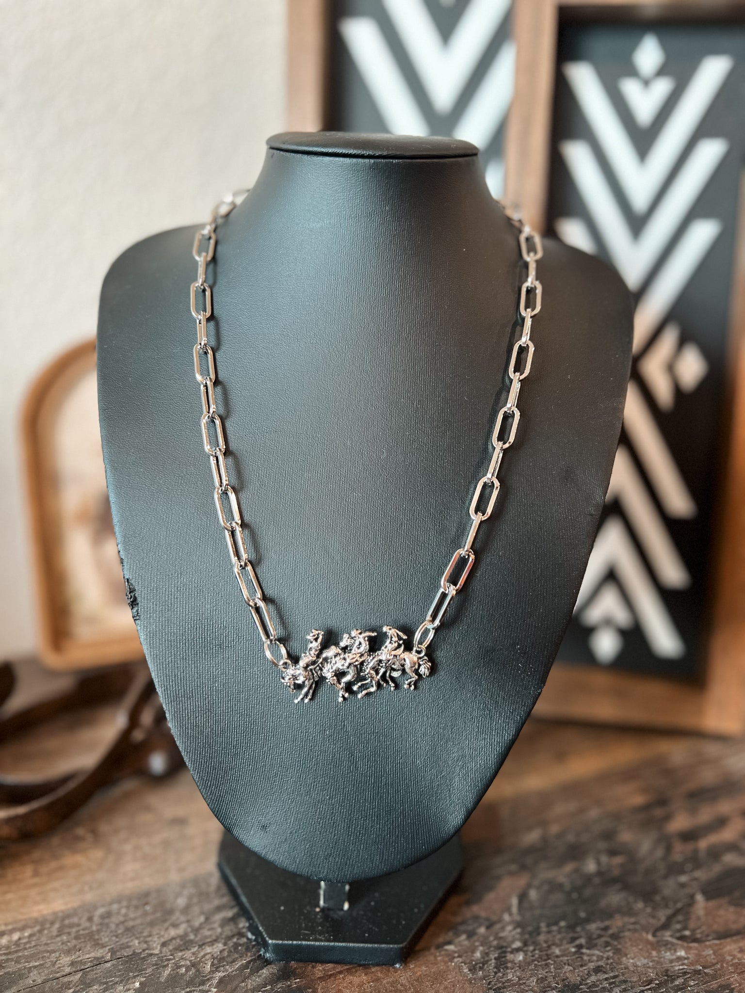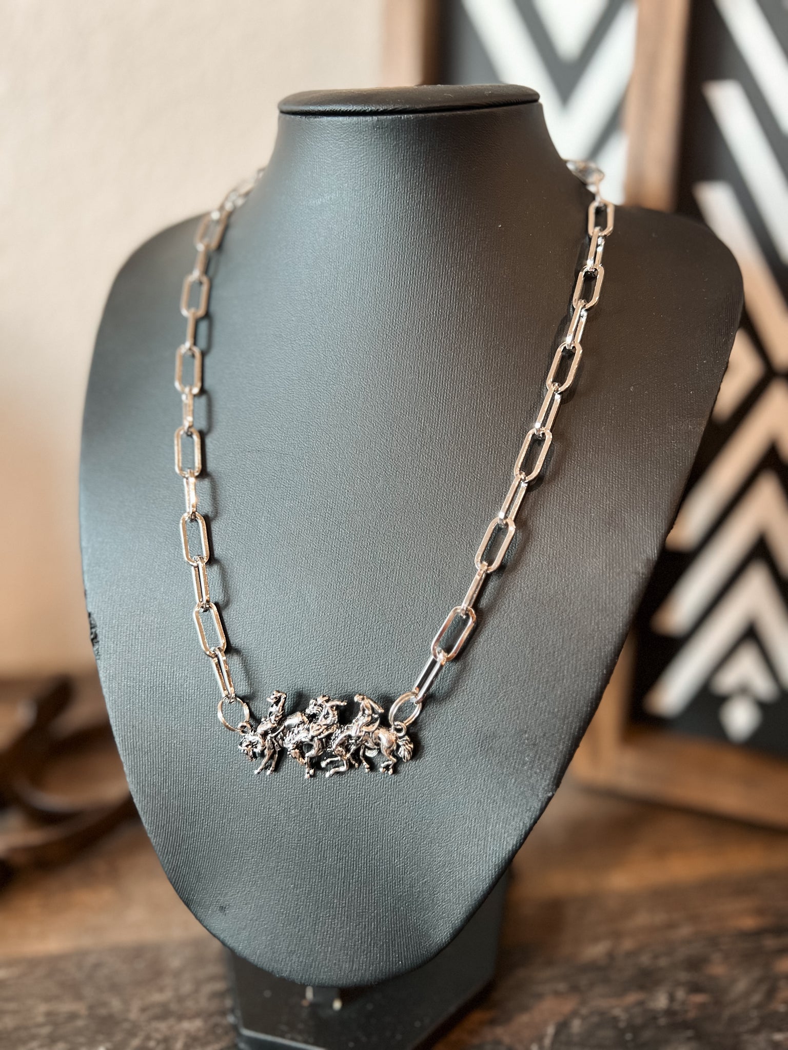 "Ride in style with the Bronc Rider Necklace! This unique pendant necklace features a bronc rider on a sturdy chain link necklace. It's the ultimate accessory for adding a touch of Western charm to any outfit!"