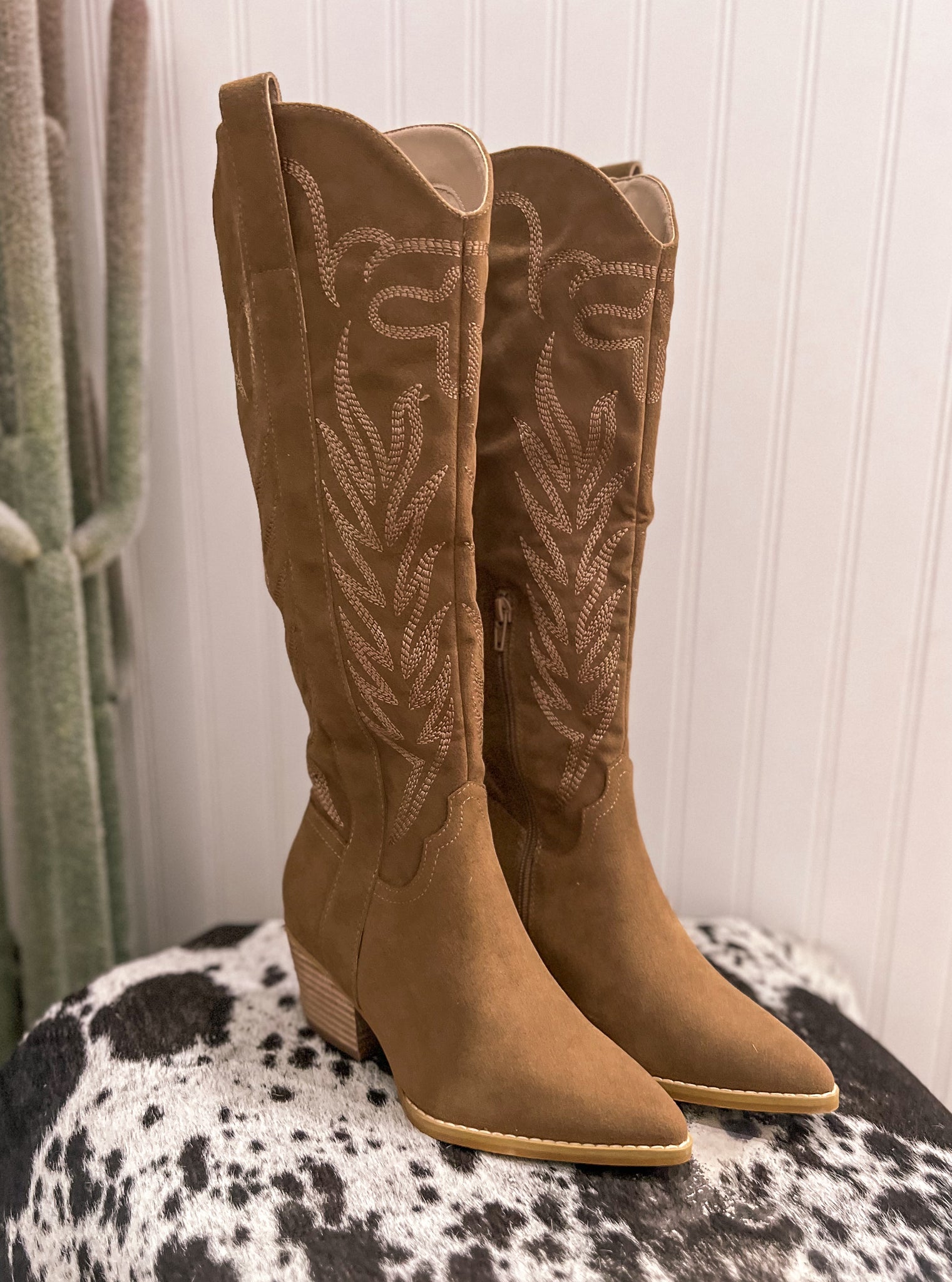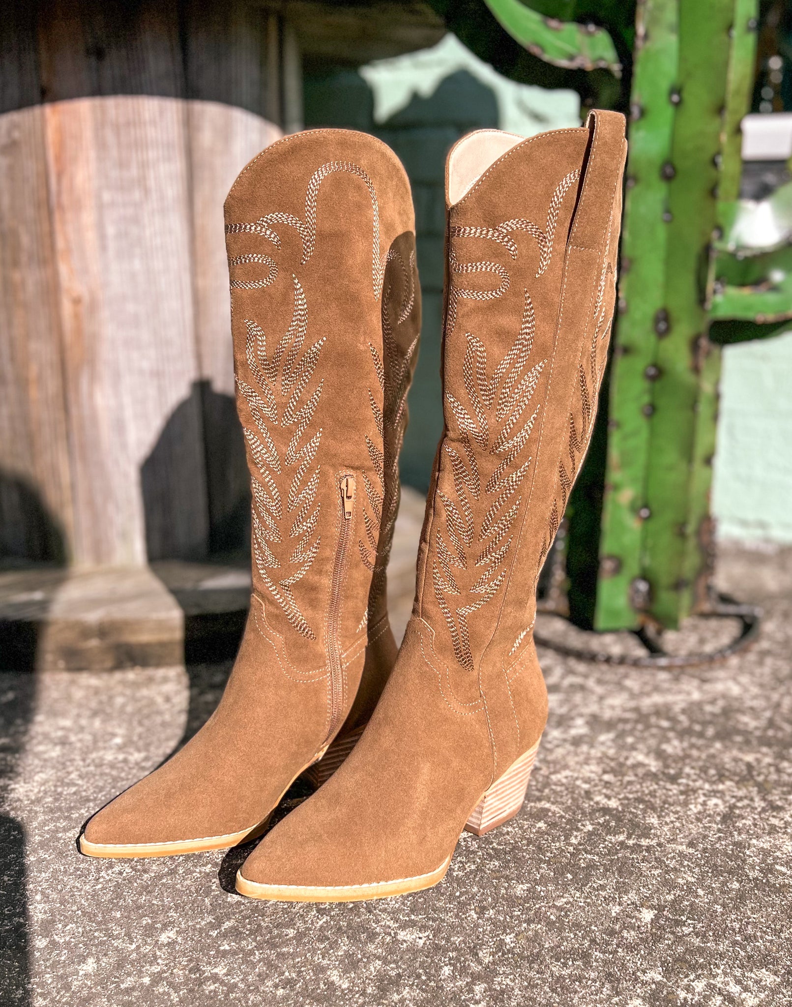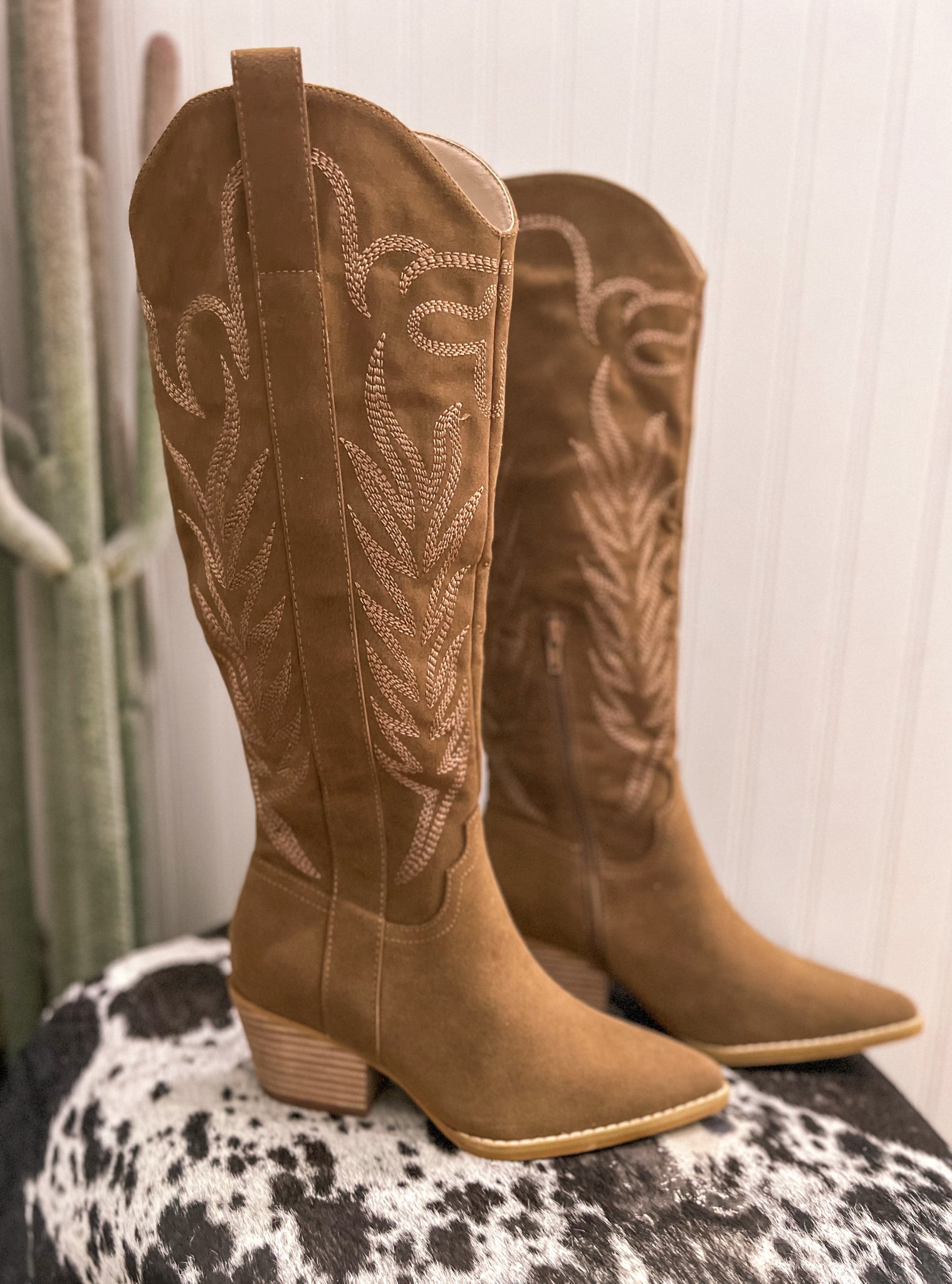 Yeehaw! Kick up your style with these Bronco Cowboy Boots. Made with soft, suede brown material and intricate embroidery, these boots will definitely turn heads. Perfect for a rodeo or a night out on the town, these boots will add a touch of wild west charm to any outfit!