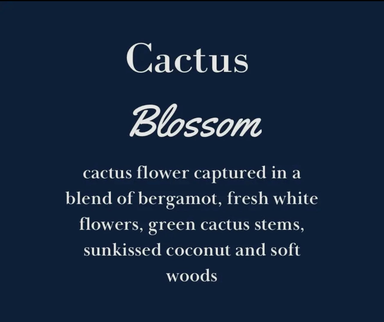 Bright, floral, and sun-warmed - Cactus Blossom captures the beauty of the desert in bloom. This uplifting scent blends bergamot and fresh white flowers with green cactus stems, sun-kissed coconut, and soft woods. Fresh and gently sweet, it's a clean, comforting fragrance that brings a touch of desert sunshine and open-air calm to your home.