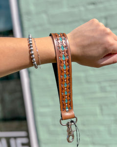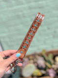 Beautifully tooled with desert blooms and traditional Southwestern medallions, this artisan leather key fob brings a touch of high desert style to your everyday carry. Turquoise accents and hand-stamped details echo the spirit of vintage Western craftsmanship. Carry your keys with sublime style!
