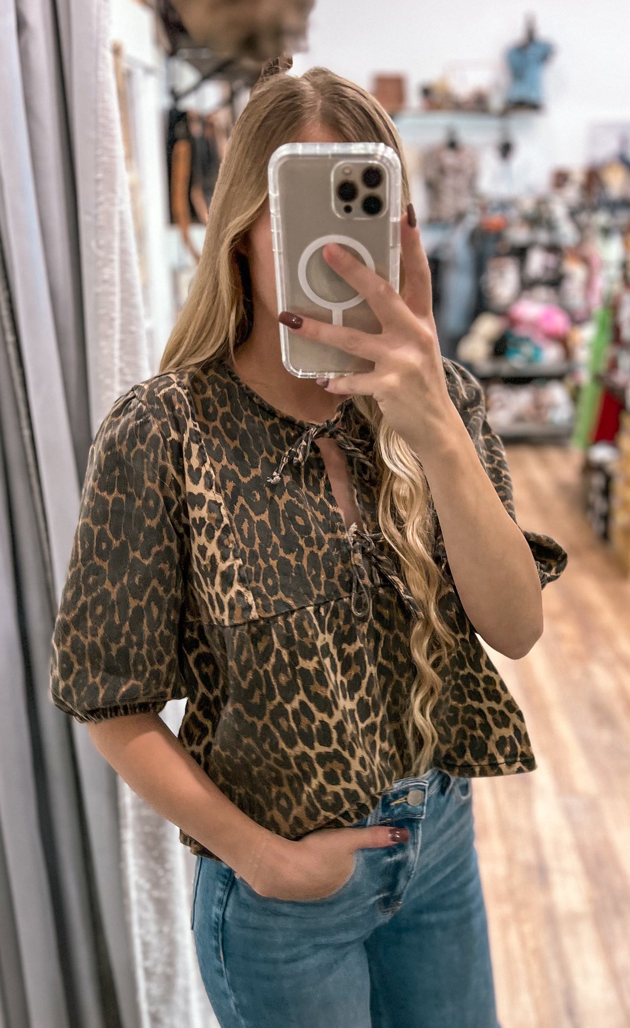 Go wild with this Cheetah Crush Top! With its playful puff sleeves and trendy denim tie front detail, you'll be a fashionista on the prowl. Unleash your inner strength and fierce style with this unique top.