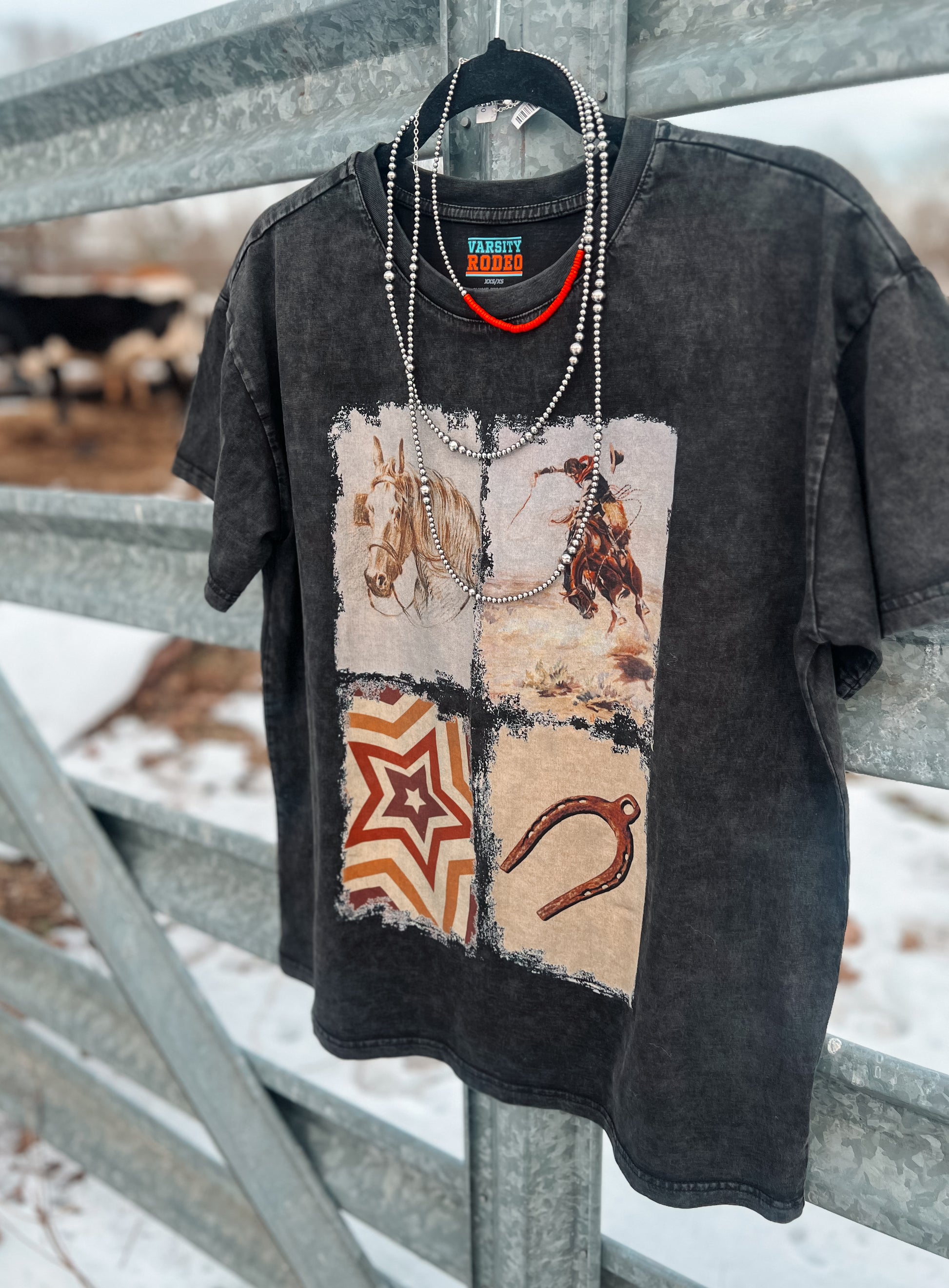 This relaxed-fit graphic T-shirt is made from a soft jersey fabric with a washed black finish. The front features a four-panel western-inspired graphic, giving it an easy, worn-in look suited for casual everyday wear.