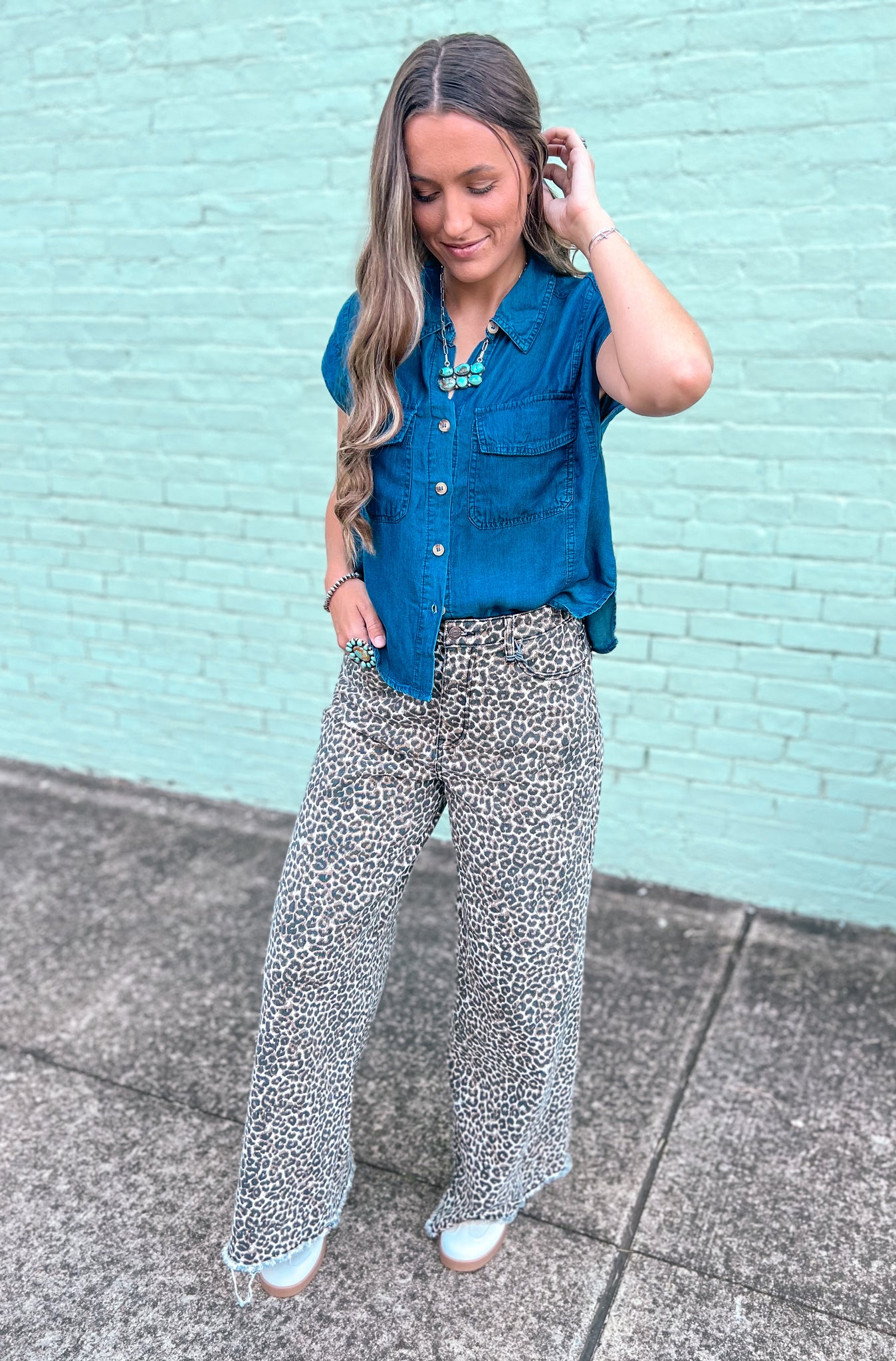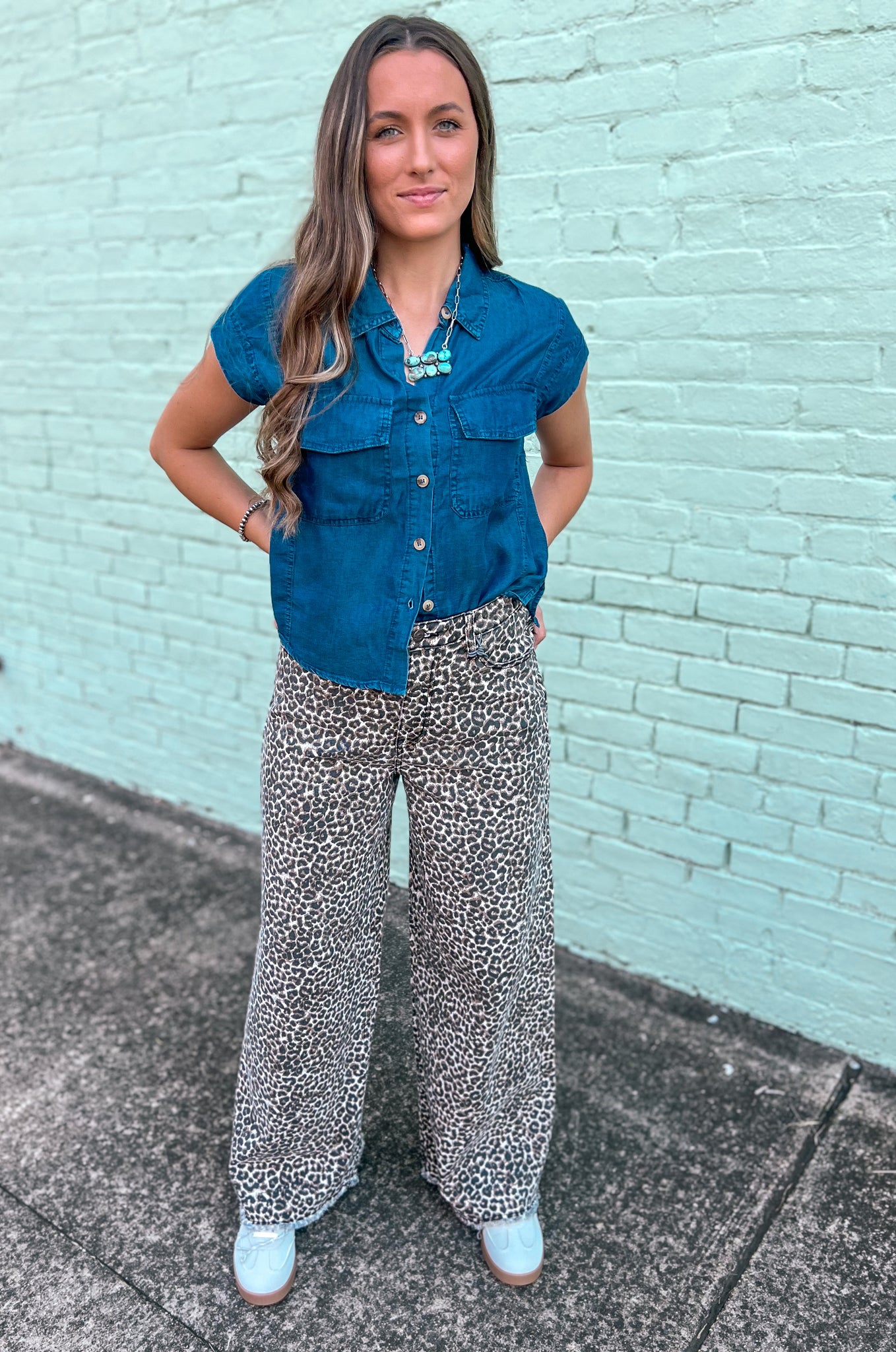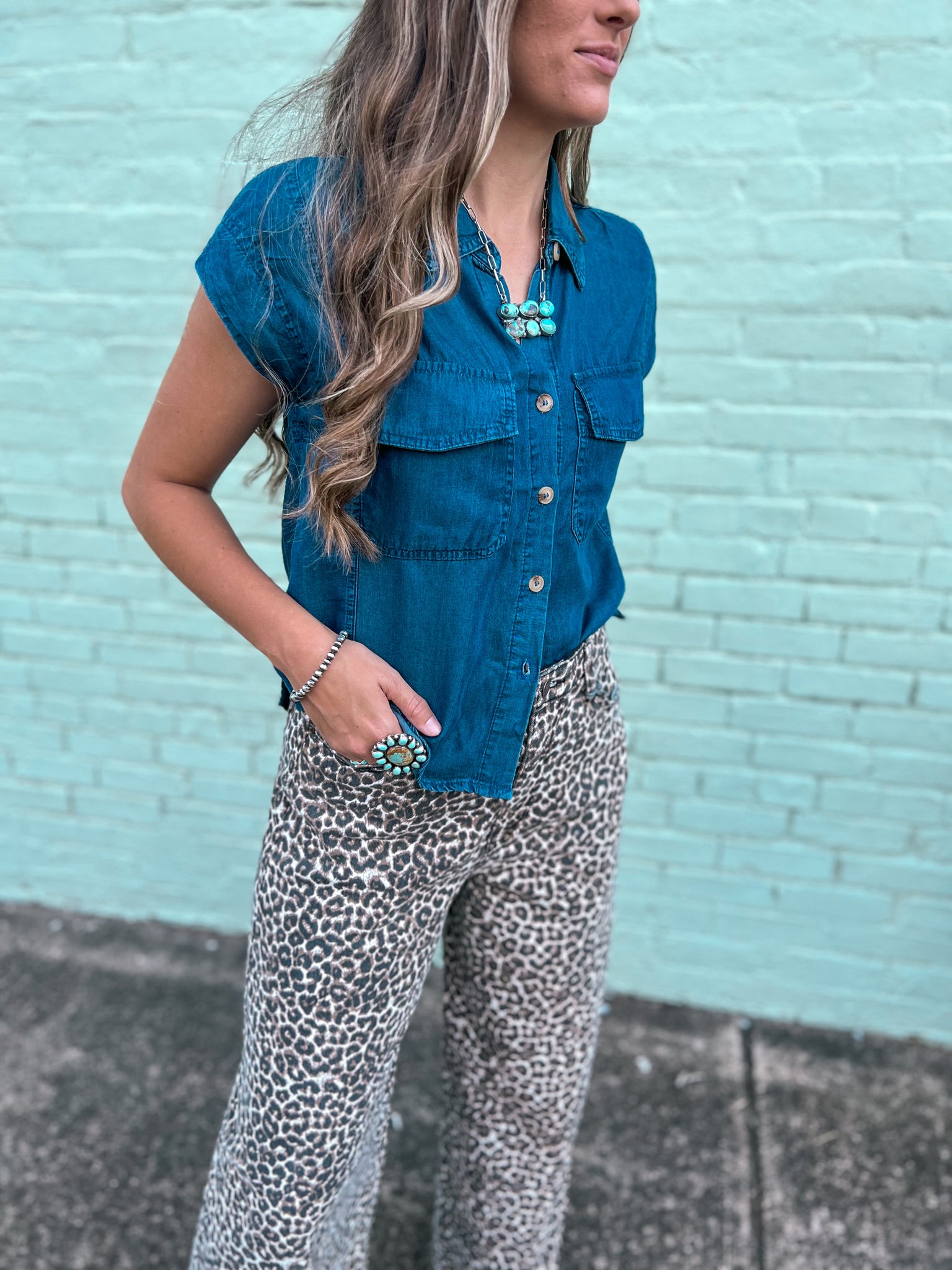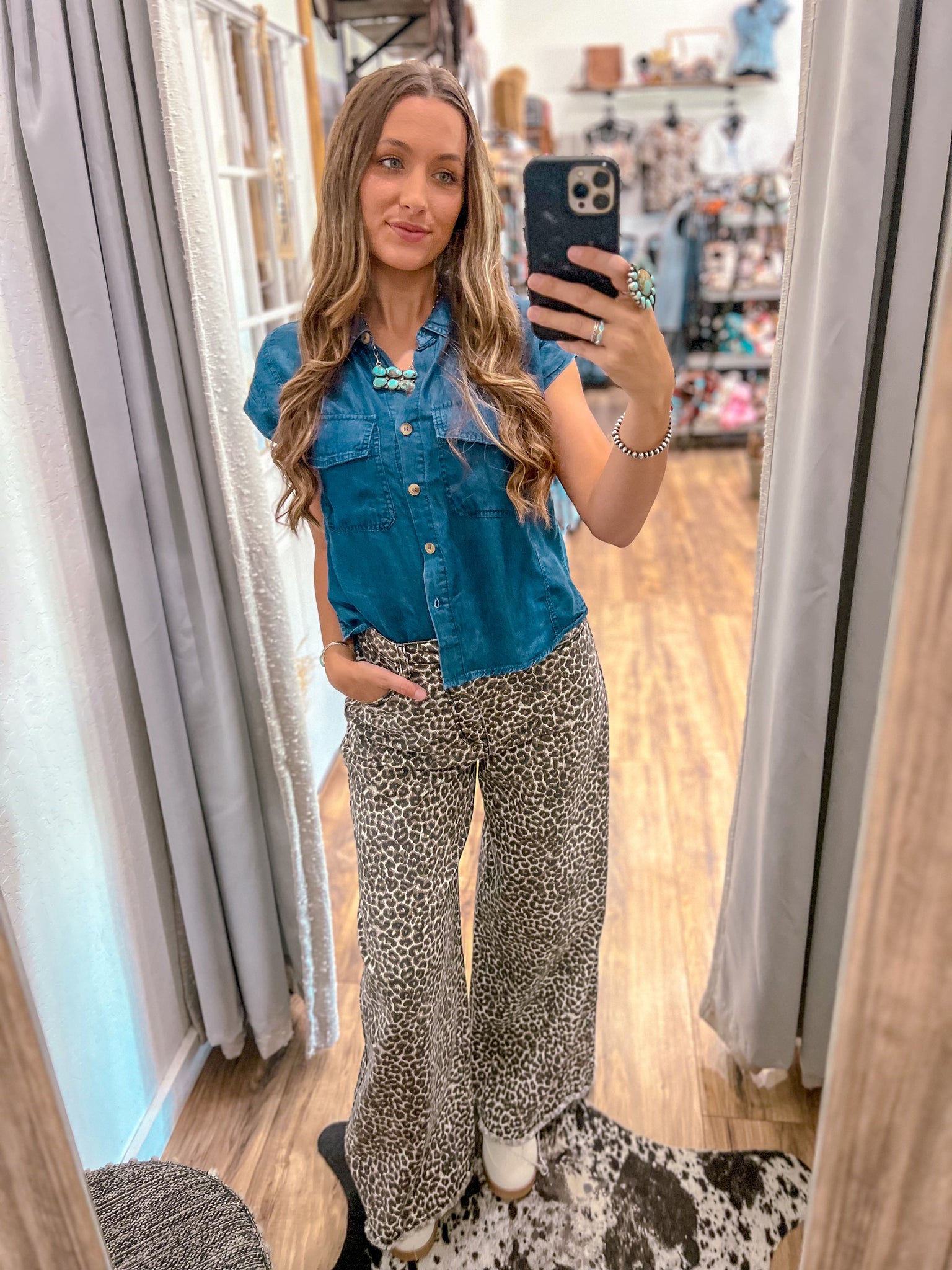 Denim pocket button down top! Super lightweight and pairs perfectly with our new Leopard High Rise Wide Leg Jeans!