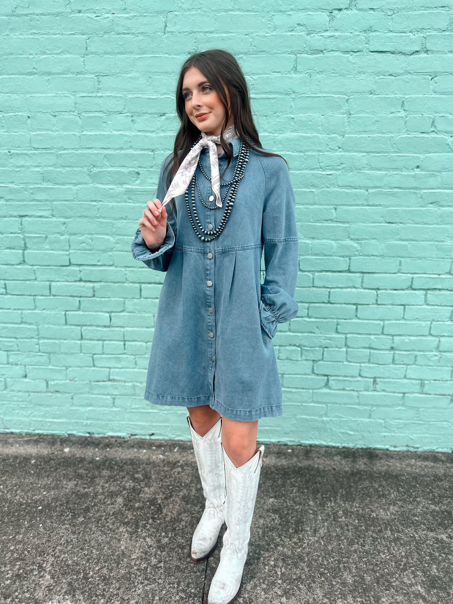 Take a button down dress and mix it with washed denim - the result? A playful, quirky outfit that's just as comfortable as it is stylish. With a nod to 90s fashion, this dress is perfect for any casual occasion. Get ready to rock your denim!