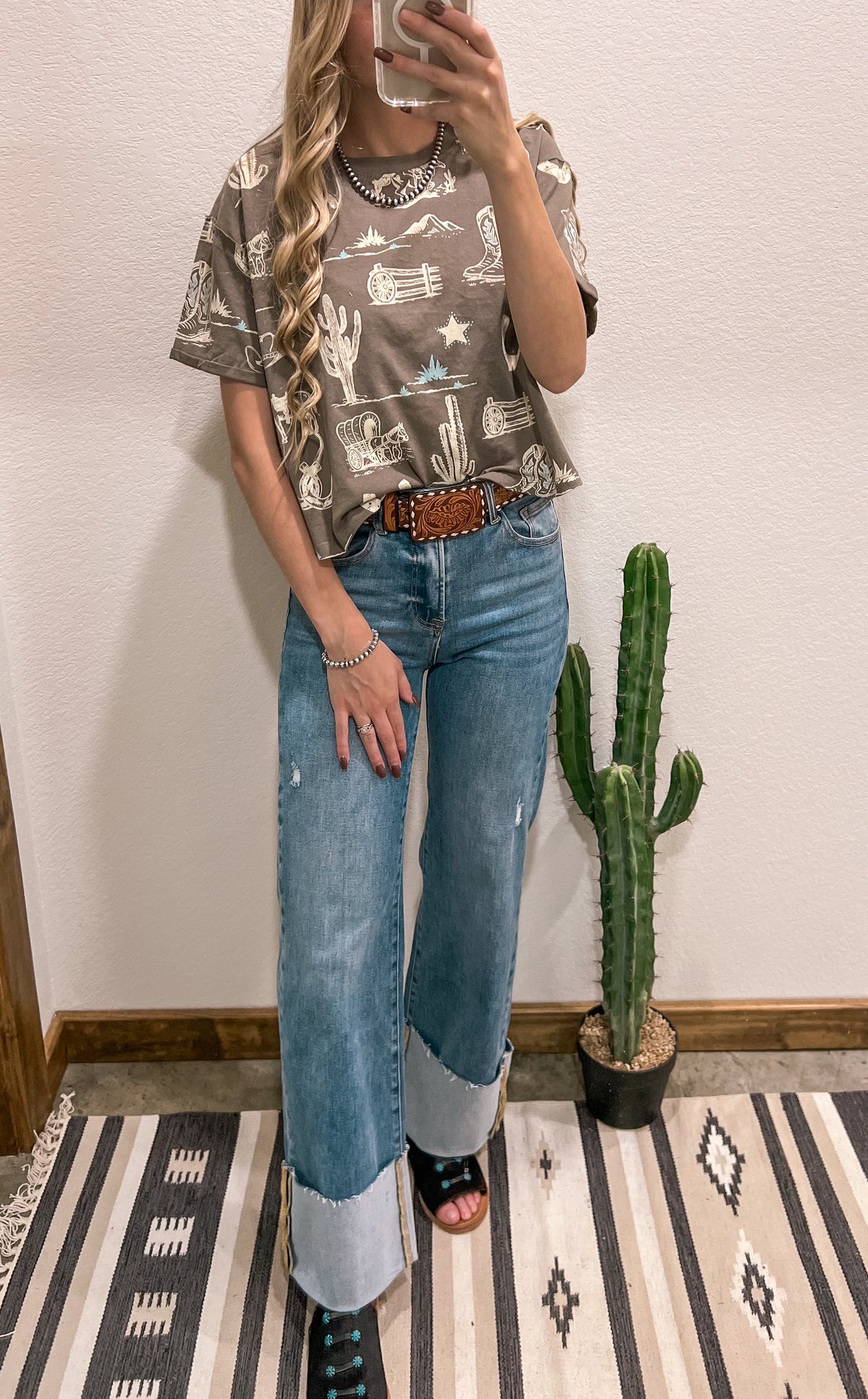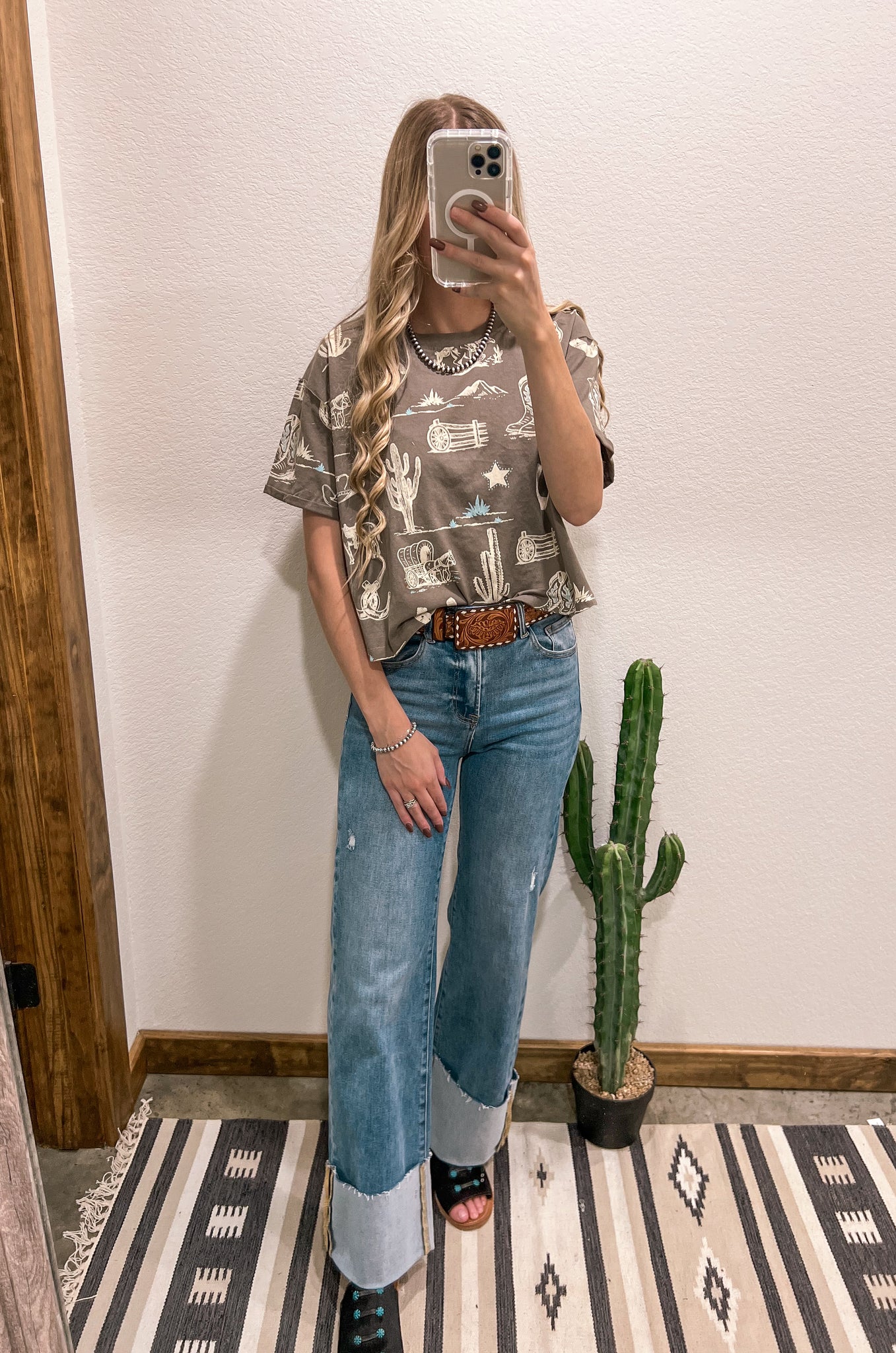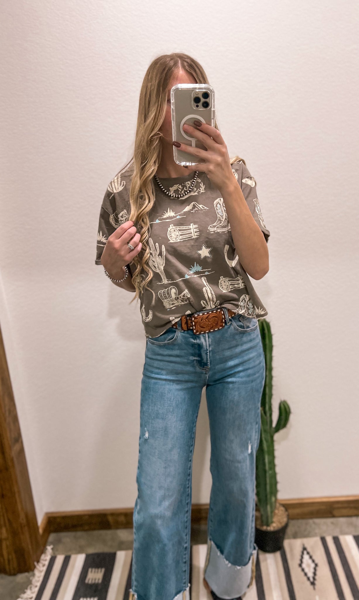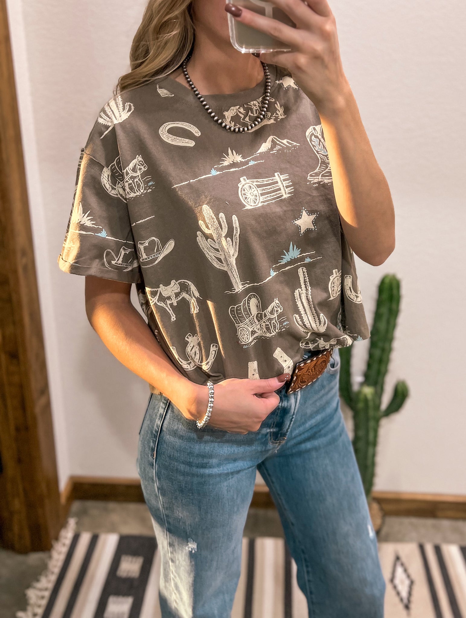 Unleash your inner cowgirl with the El Dorado Top. This Western printed t-shirt boasts a slightly cropped fit and short sleeves, perfect for a stylish yet relaxed look. Yeehaw!