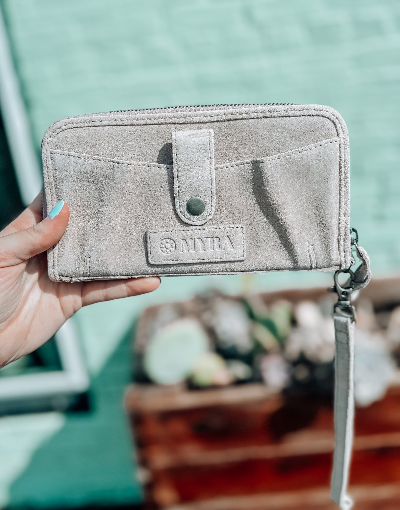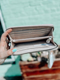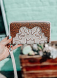 Embrace the spirit of the high desert with this striking wallet featuring rich forest green suede and saddle brown accents. The look of hand-tooled leather florals meets golden embroidery in a stunning Western medallion design. Perfect for the modern trail blazer who loves to mix classic ranch style with contemporary desert chic. Plenty of compartments and space inside for your essentials. Wrap-around zipper closure with matching wristlet carrying strap.