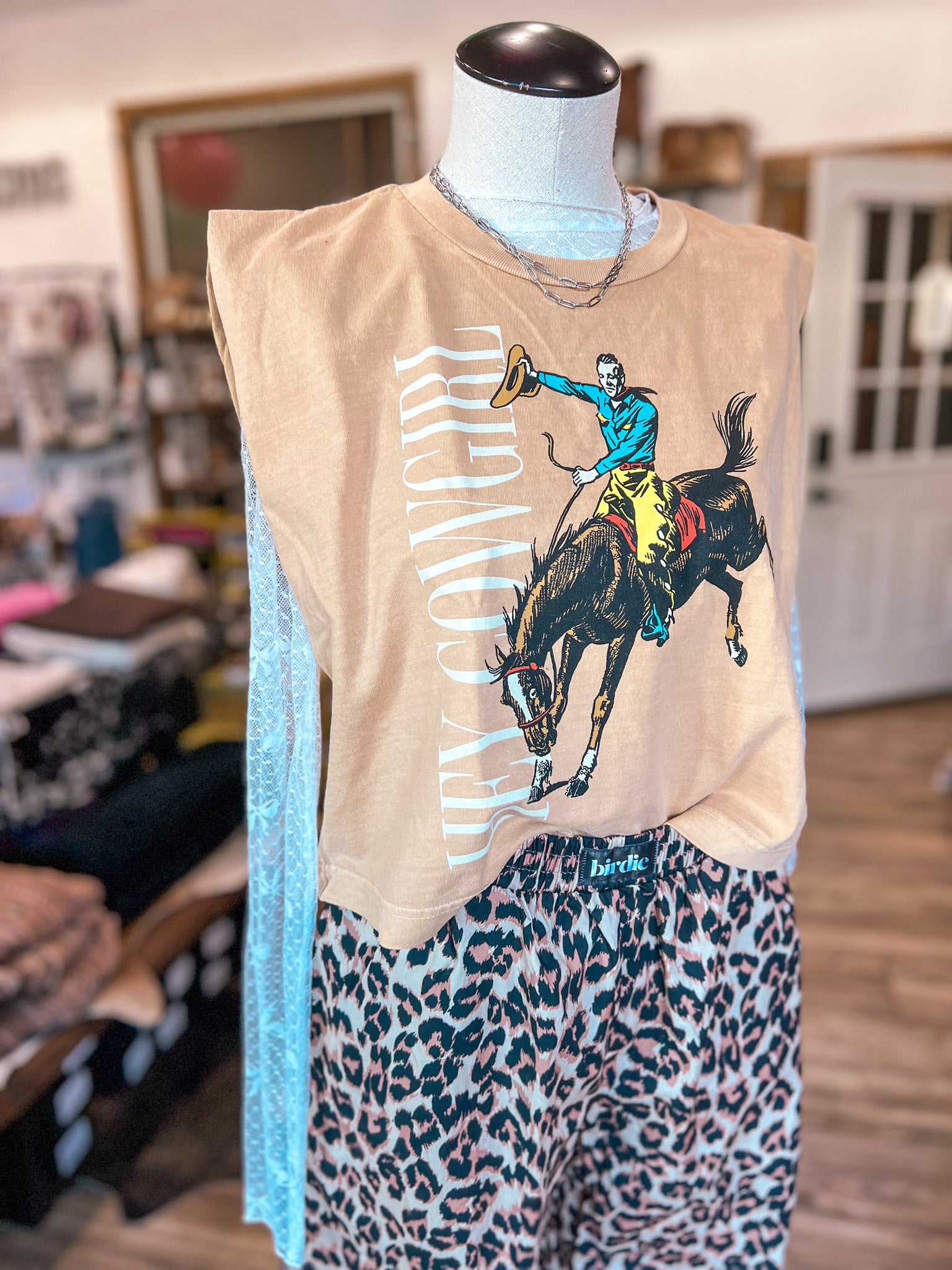 Yeehaw style meets comfort with this Hey Cowgirl Muscle Tank. Featuring a western graphic and mineral wash design, this tank is perfect for any country-loving gal. Saddle up and show off your unique style with this quirky and fun muscle tank. Giddy up, cowgirl!