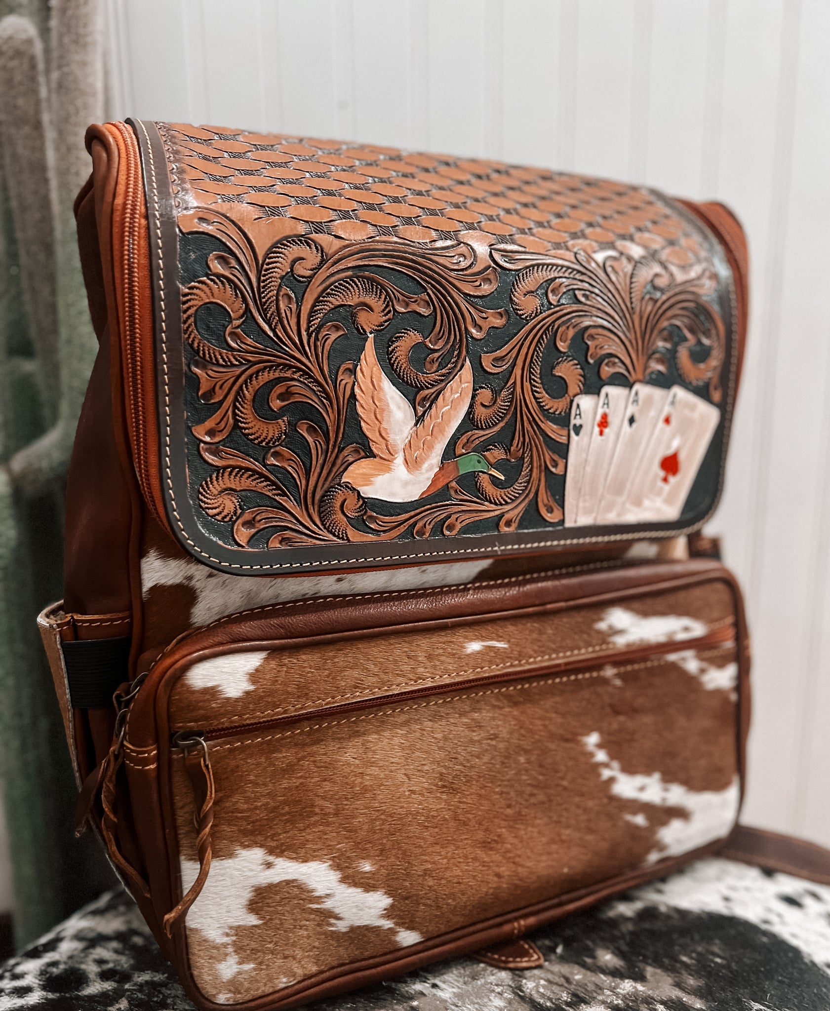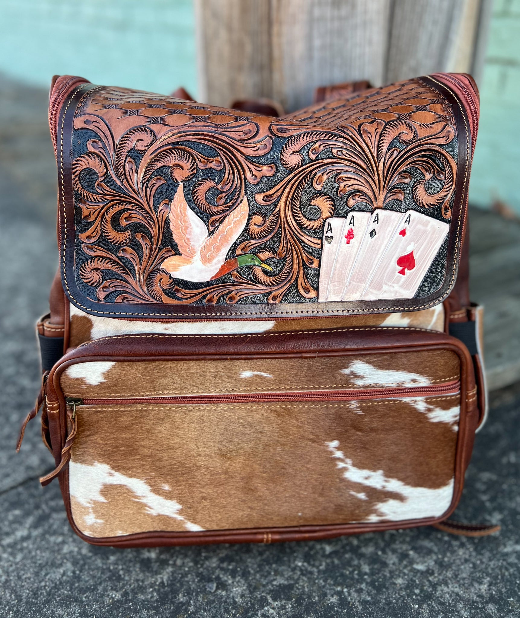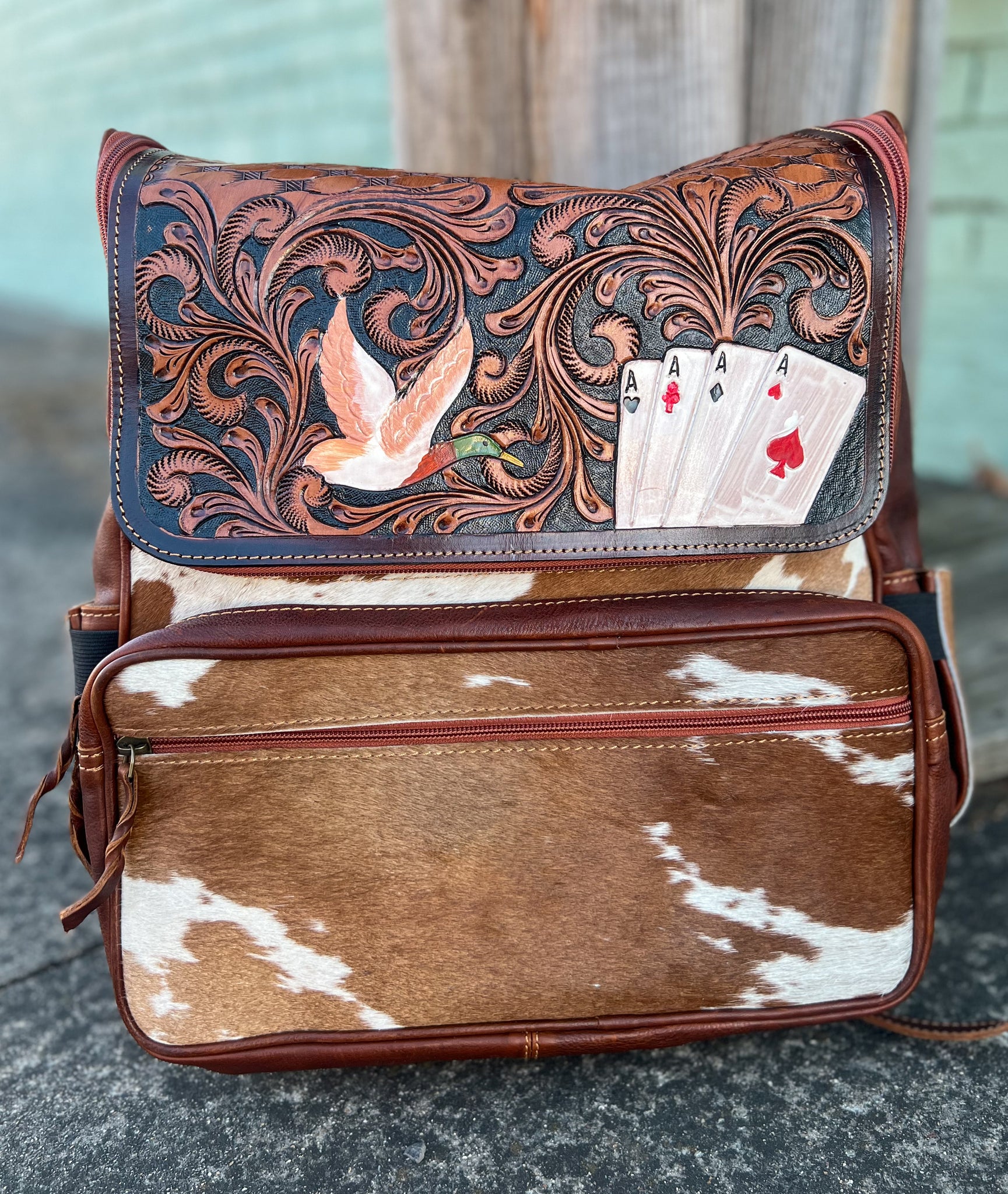 The High Stakes Drake Backpack is the perfect blend of style and functionality. Crafted with tooled leather and adorned with duck and ace cards, it's both eye-catching and durable. Carry all your essentials in this unique backpack and stand out from the crowd.