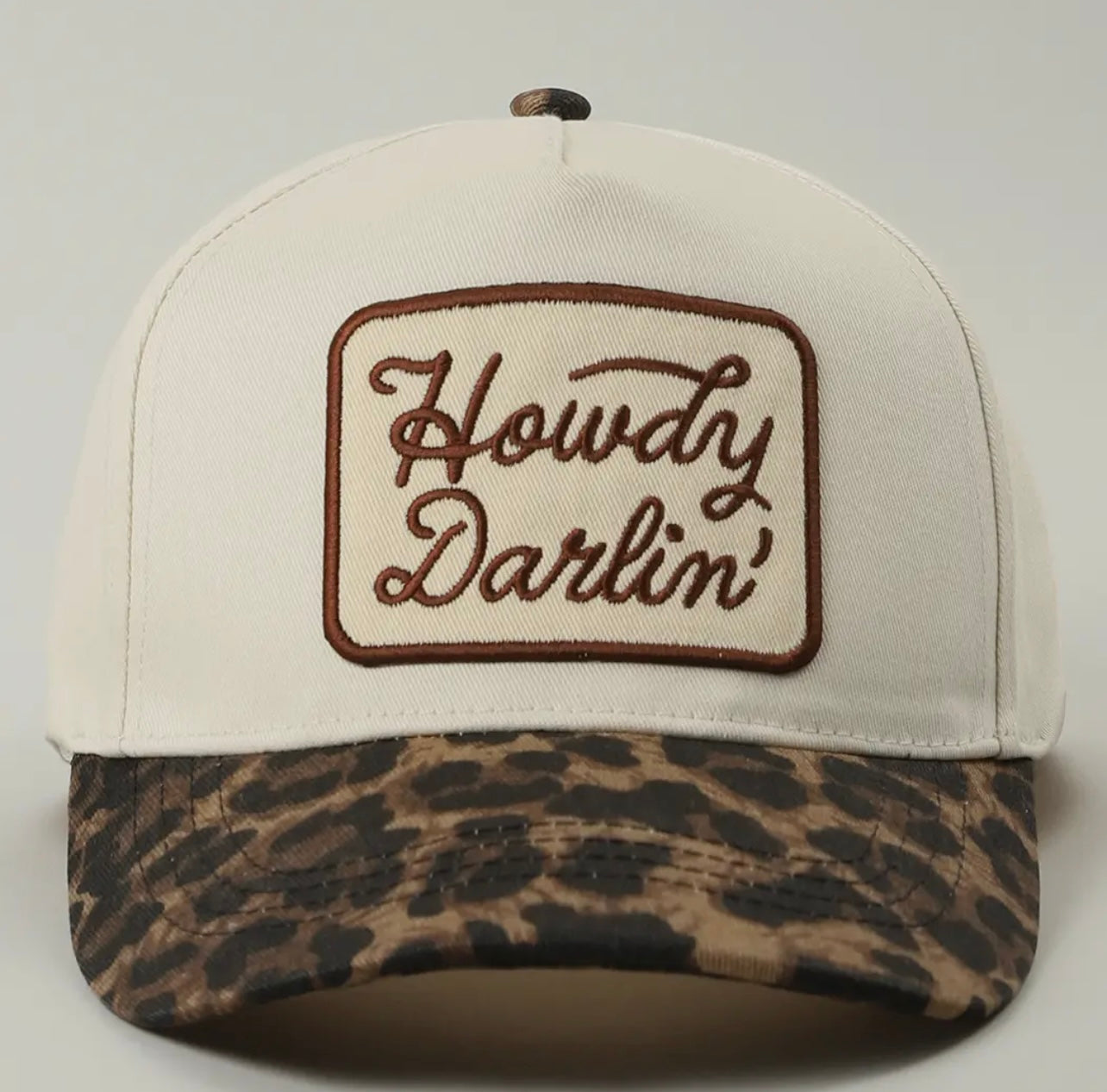"Howdy Darlin'" embroidered cap. Featuring a vintage-inspired patch and bold leopard print brim, this hat is the perfect mix of Western sass and modern style. The structured crown ensures a flattering fit, while the adjustable snapback closure provides all-day comfort for most head sizes. Whether you're heading to a country concert, a girls' weekend, or just want to turn heads, this cap adds a fun, flirty touch to any look. Durable, eye-catching, and full of personality — it's a must-have for any Western-loving fashionista.