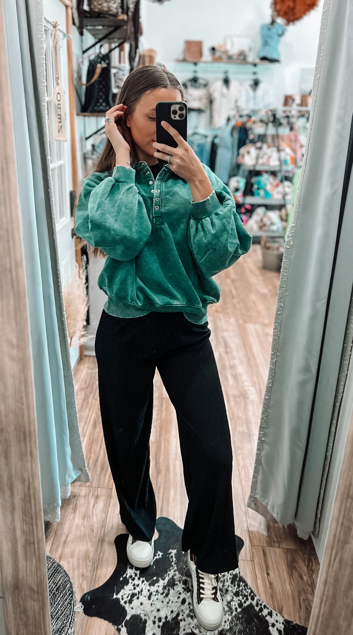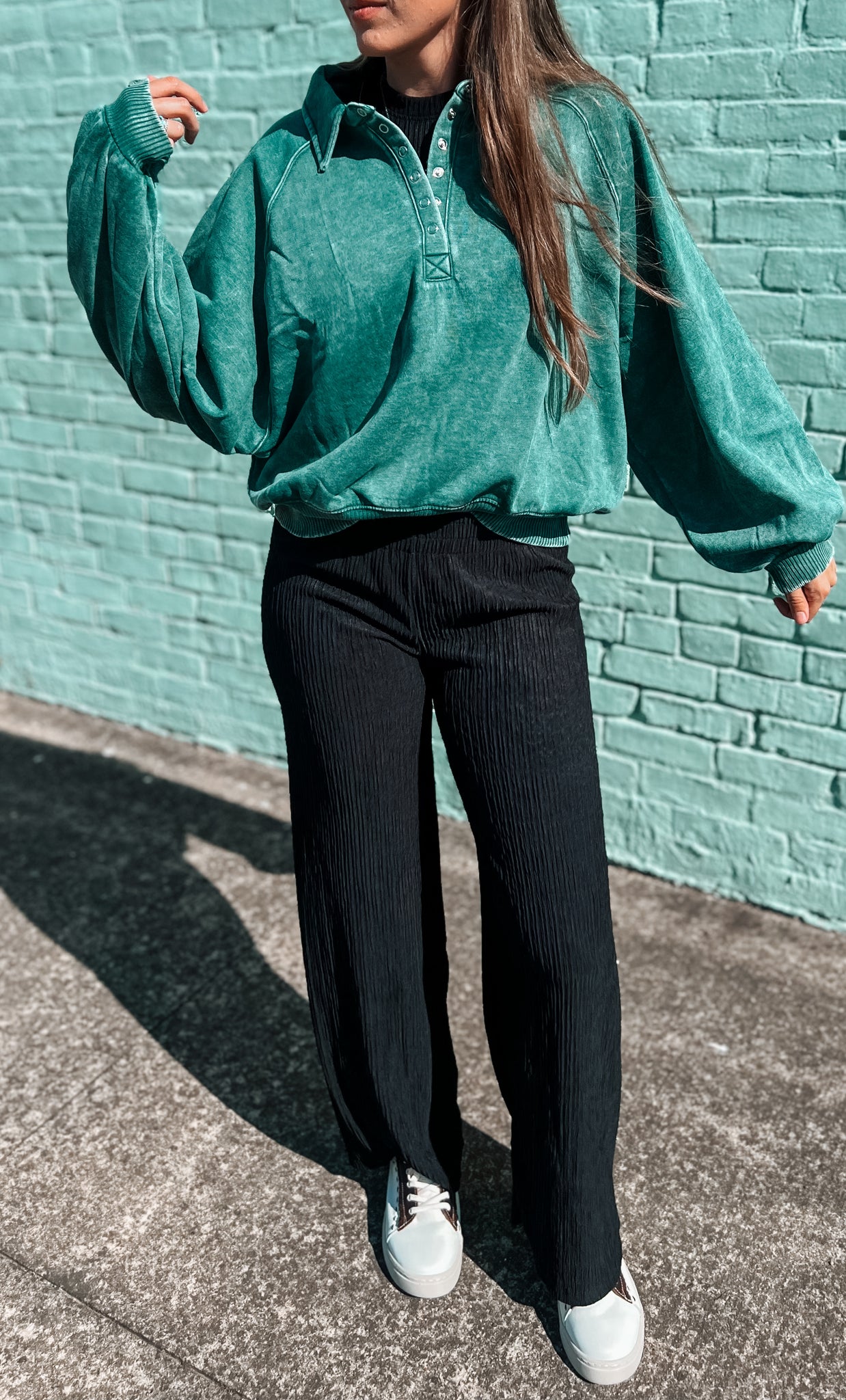 The Kallie Sweatshirt is a fleece lined pullover with a collar and button detailing and a smocked bottom.