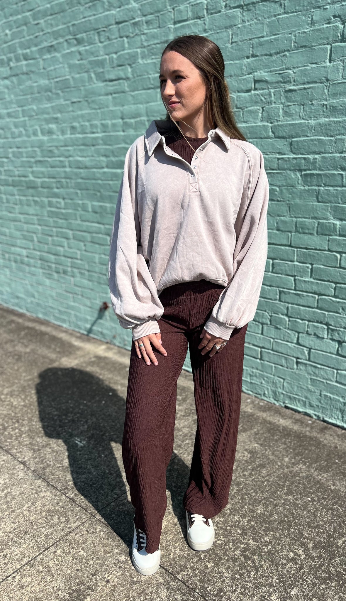 The Kallie Sweatshirt is a fleece lined pullover with a collar and button detailing and a smocked bottom.