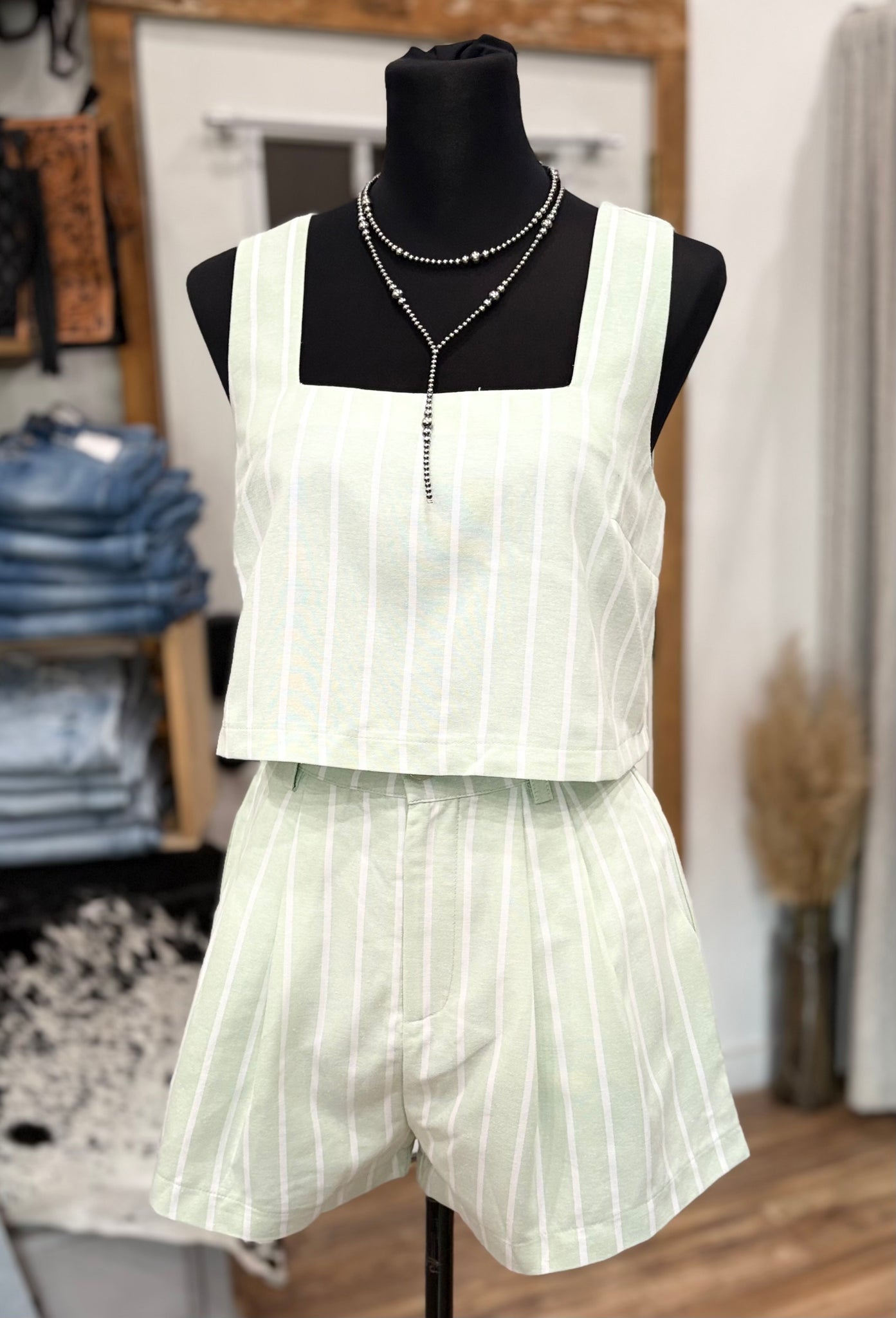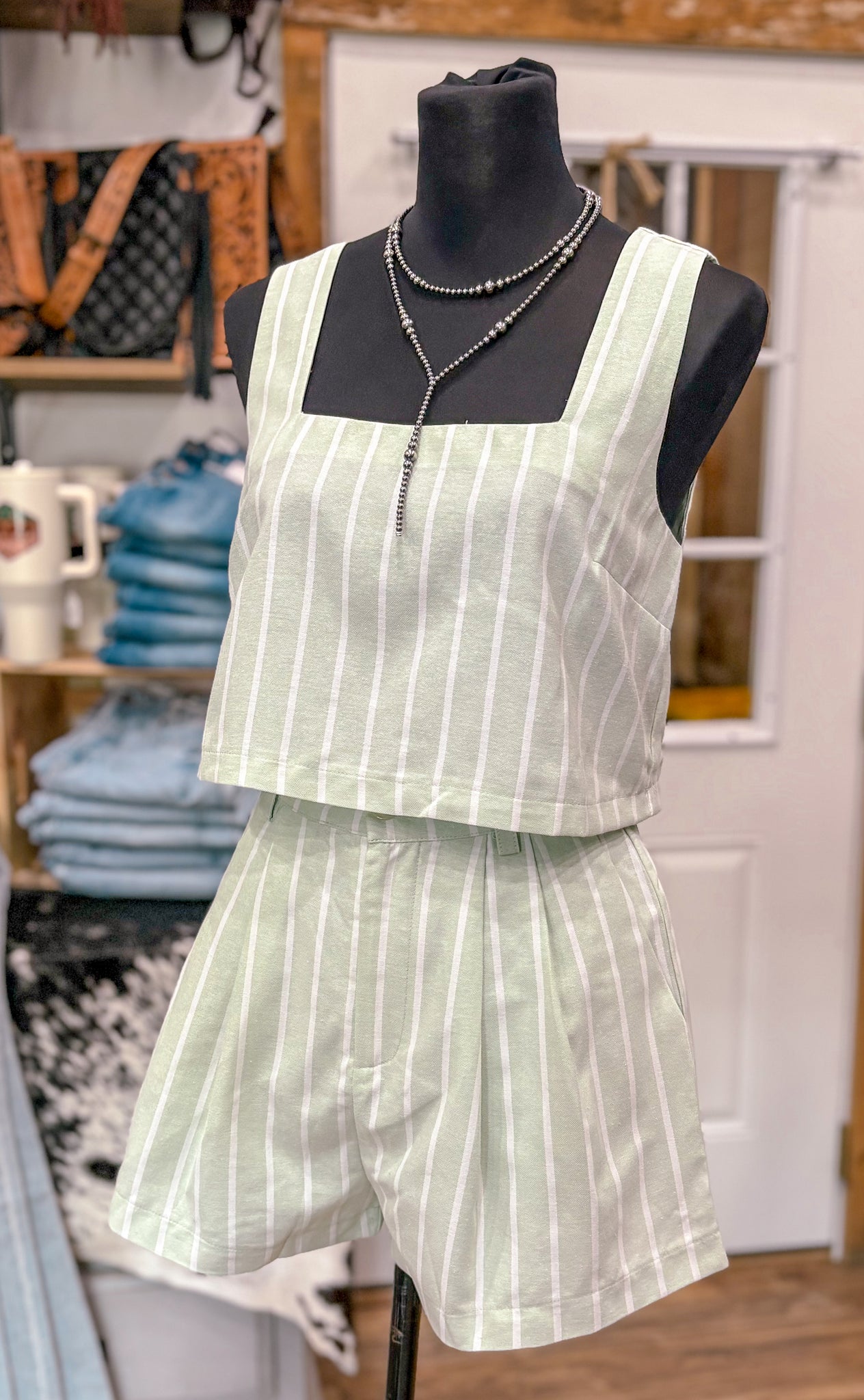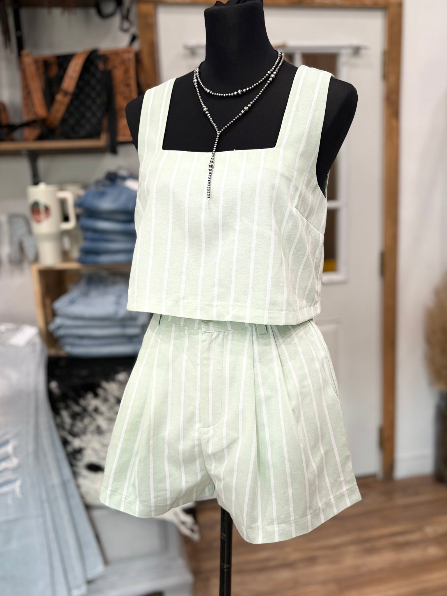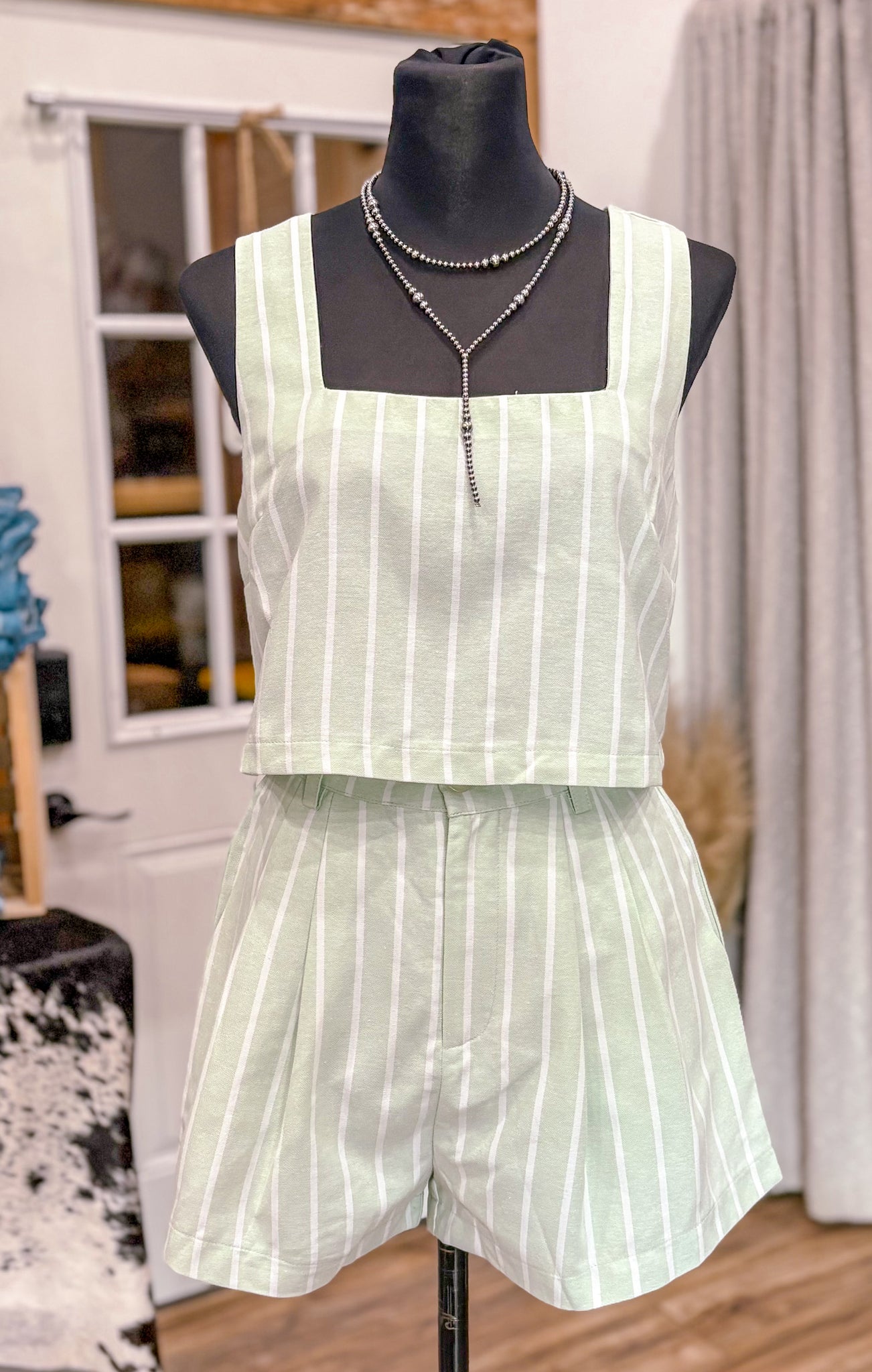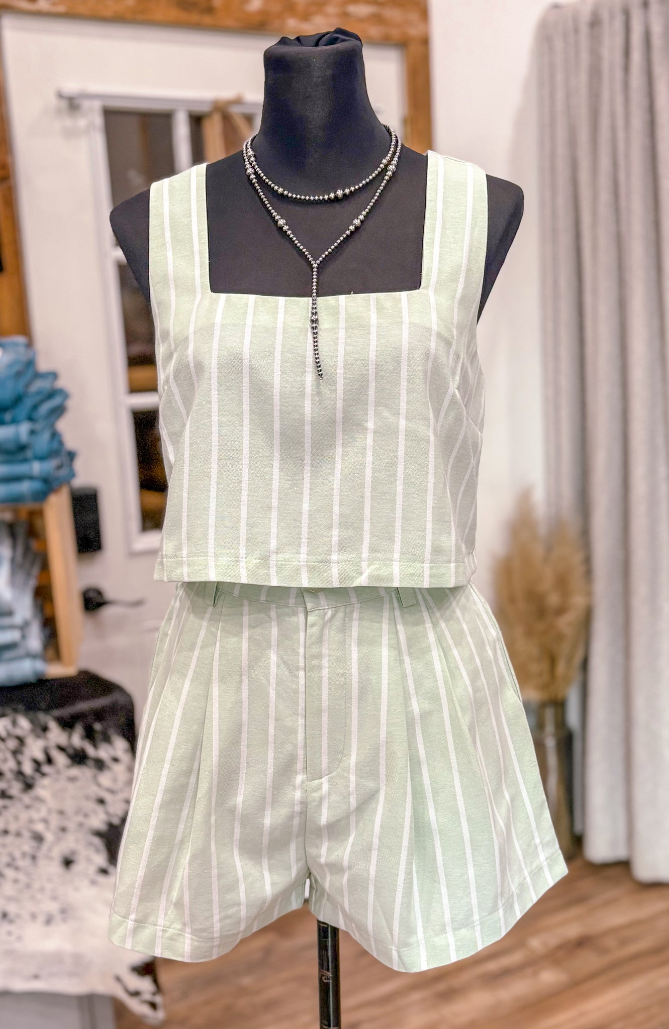 "Unleash your playful side with the Kelsey Stripped Set, featuring an apple green striped crop top and shorts. Perfect for a fun summer day out, this set is sure to make heads turn!"