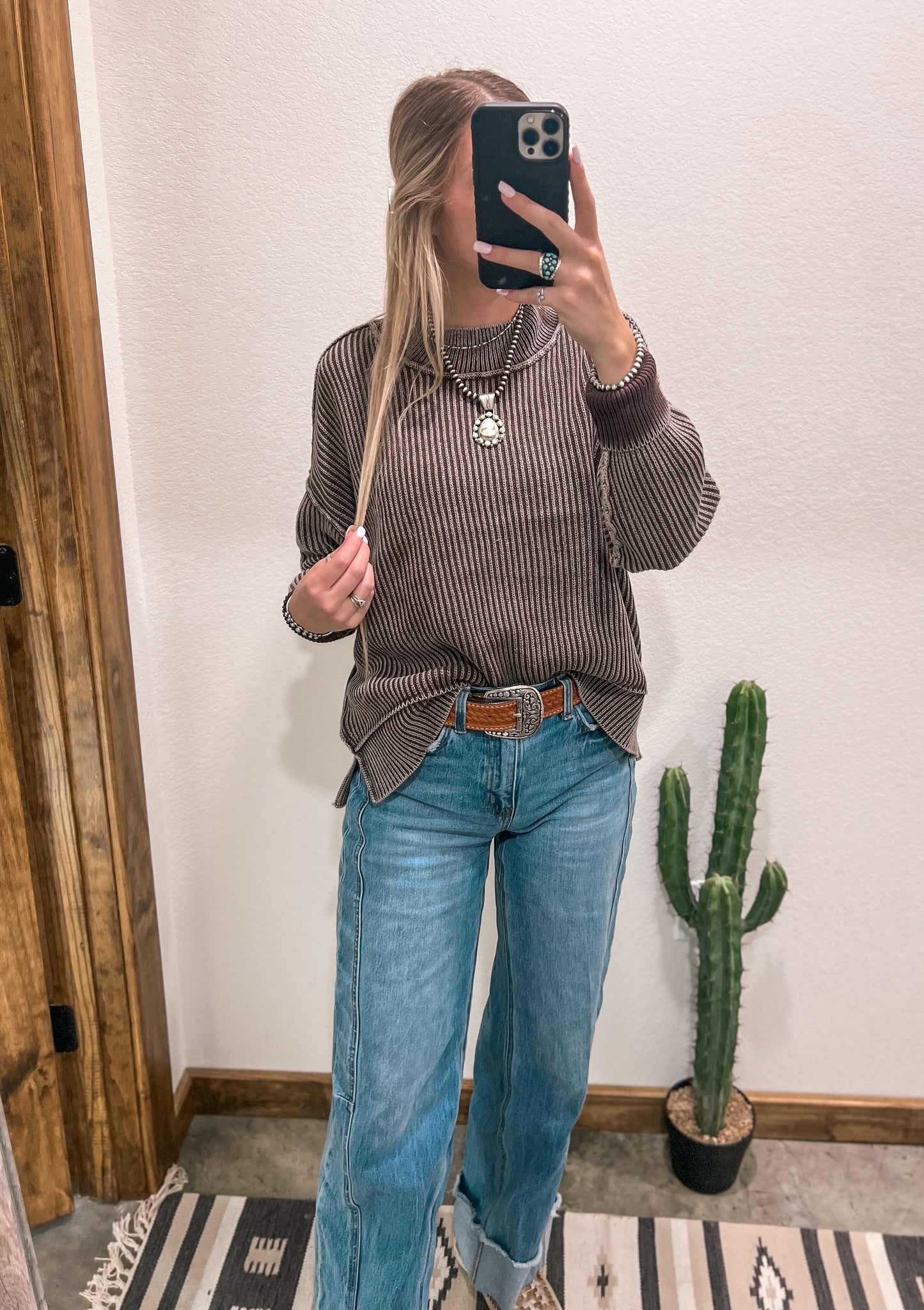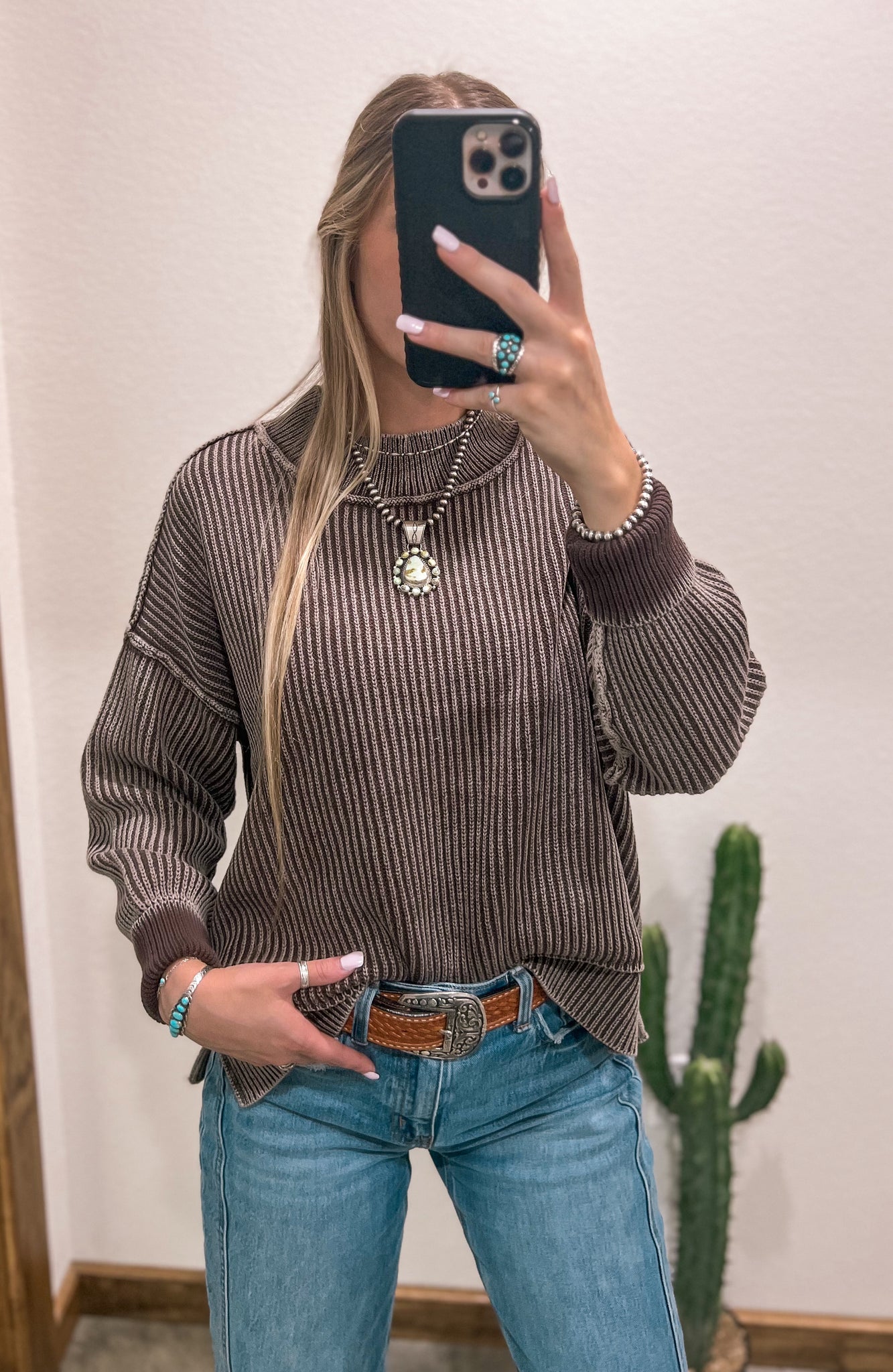 Get ready to cozy up in style with our Lenna Oversized Sweater in brown! This washed ribbed sweater features an oversized fit and side slits for a trendy twist. Stay warm and fashionable this season.
