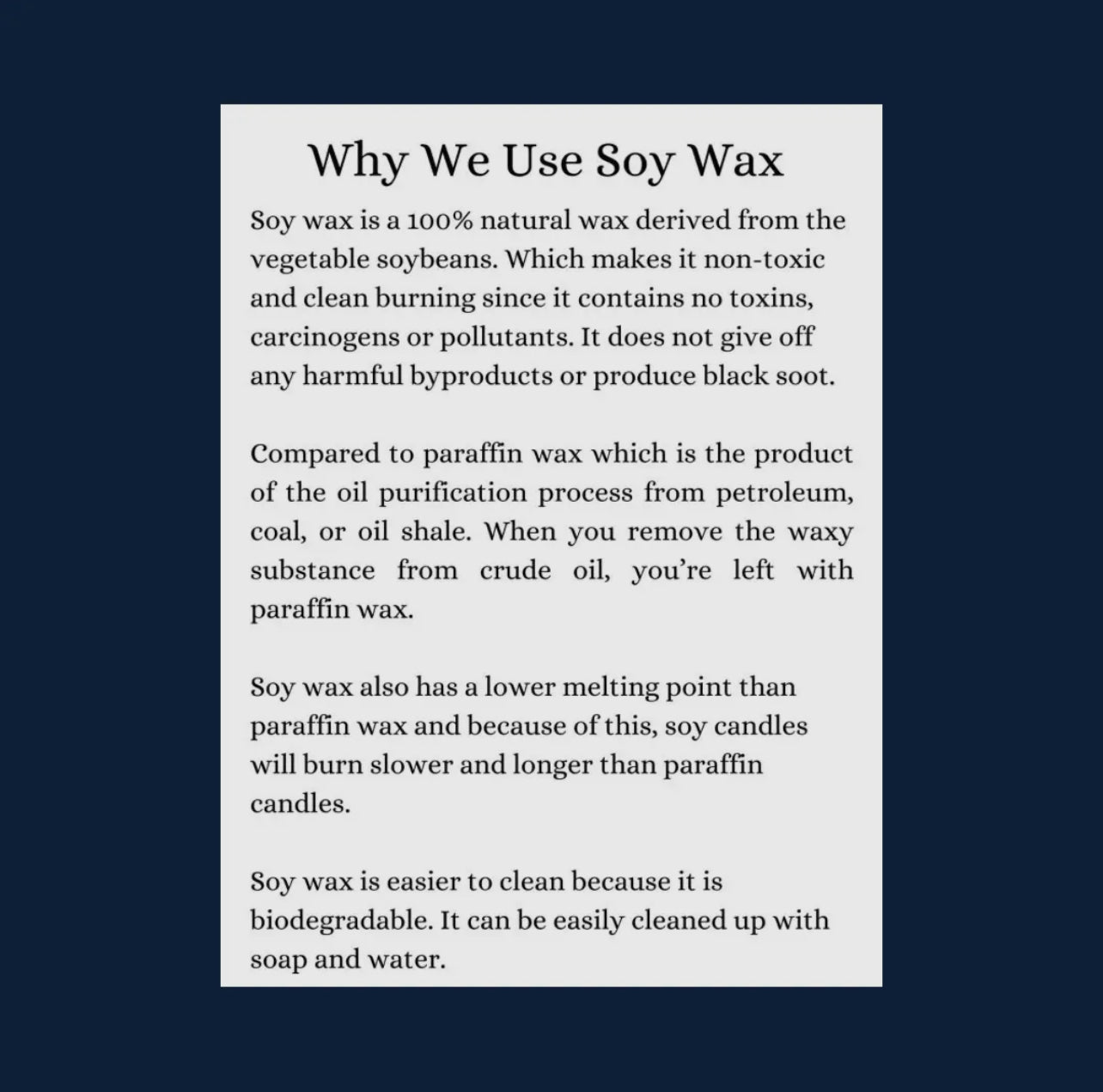 Our wax melts are made with 100% American-grown soy wax, free of dyes and scented with non-toxic, phthalate-free fragrance oils. Soy wax is biodegradable and safe to use with no flame, smoke, or soot.