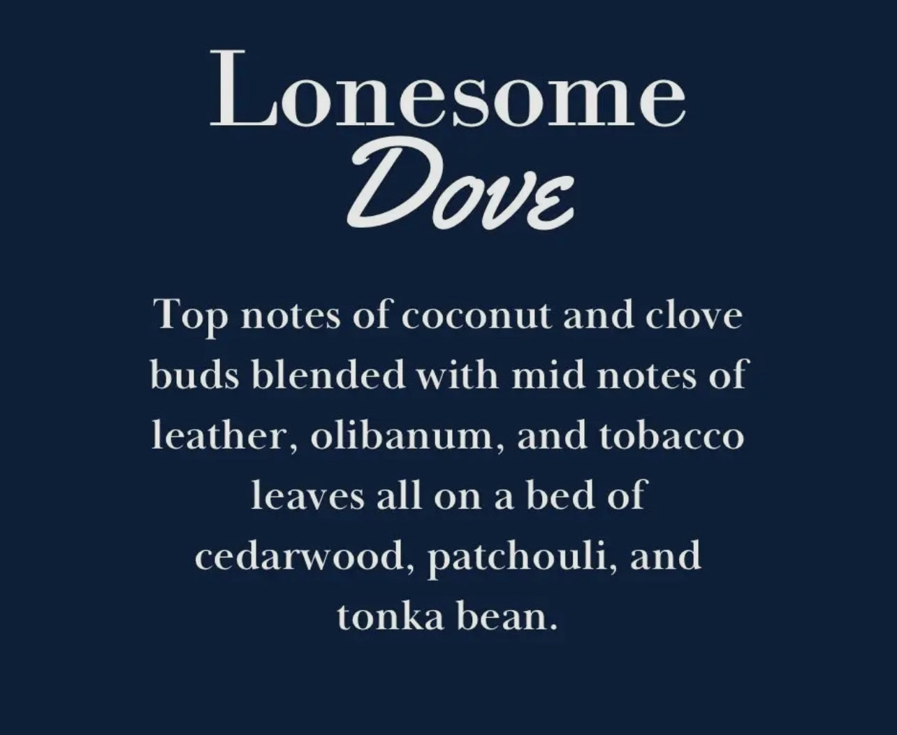 Bold and atmospheric, Lonesome + Dove blends coconut and clove buds with a rugged heart of leather, olibanum, and tobacco leaves. Anchored by cedarwood, patchouli, and tonka bean, it's a scent that captures the solitude and strength of the Western spirit.