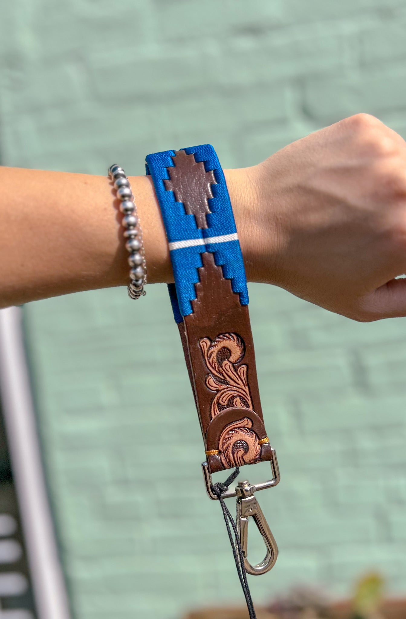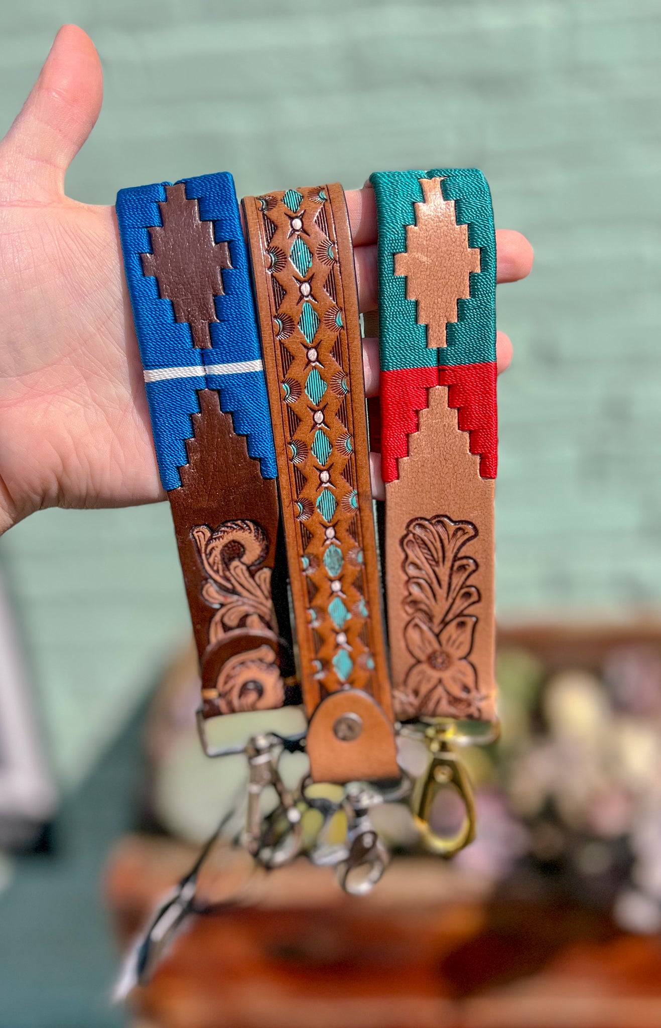 Handcrafted with embossed leather florals and vibrant Southwestern embroidery, this artisanal key fob brings a touch of desert beauty to your daily carry. The brass hardware and traditional geometric pattern capture the spirit of sunrise over the mesas. A colorful, timeless accessory!