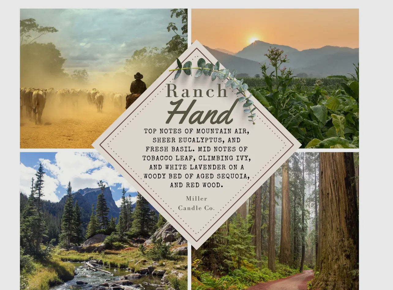 Fresh, earthy, and rugged - Ranch Hand captures the scent of open air and hard work under the Texas sun. This balanced, masculine fragrance blends crisp mountain air and eucalyptus with warm tobacco leaf, climbing ivy, and white lavender. Grounded by aged sequoia and redwood, it's the perfect scent for those who love the outdoors and the quiet strength of the Western spirit.