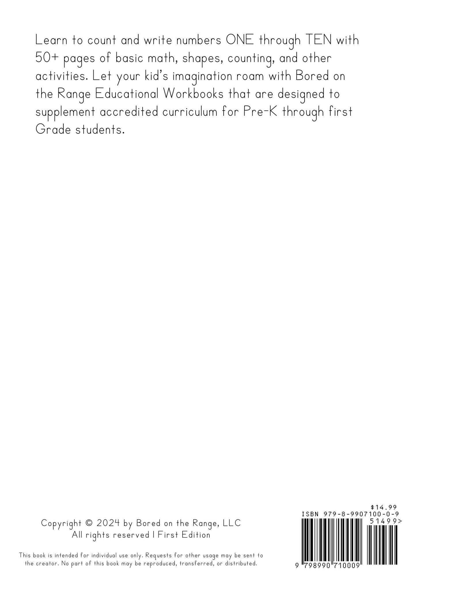Learn to count and write numbers ONE through TEN with 50+ pages of basic math, shapes, counting, and other activities. Let your kid’s imagination roam with Bored on the Range Educational Workbooks that are designed to supplement accredited curriculum for Pre-K through first Grade students.