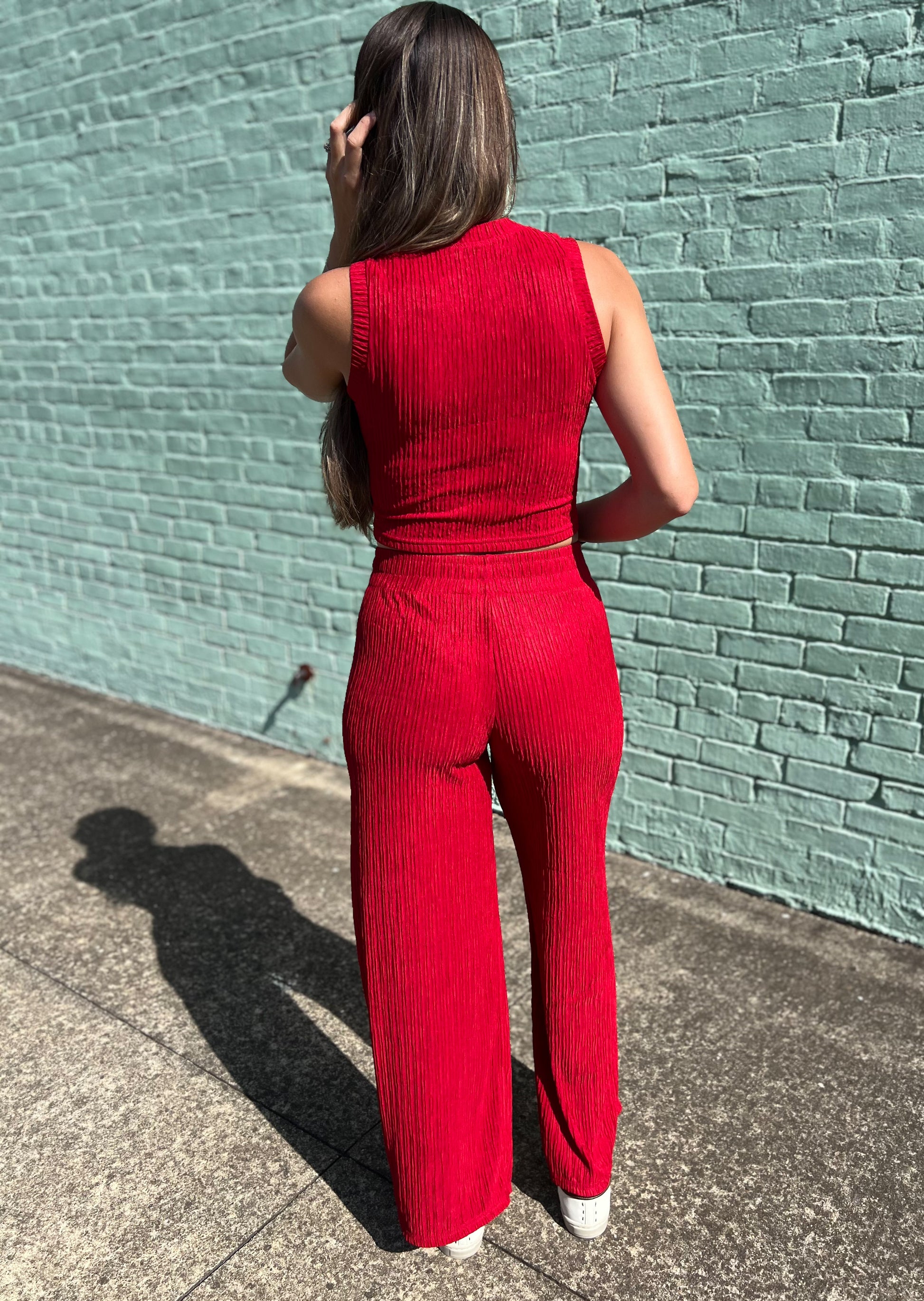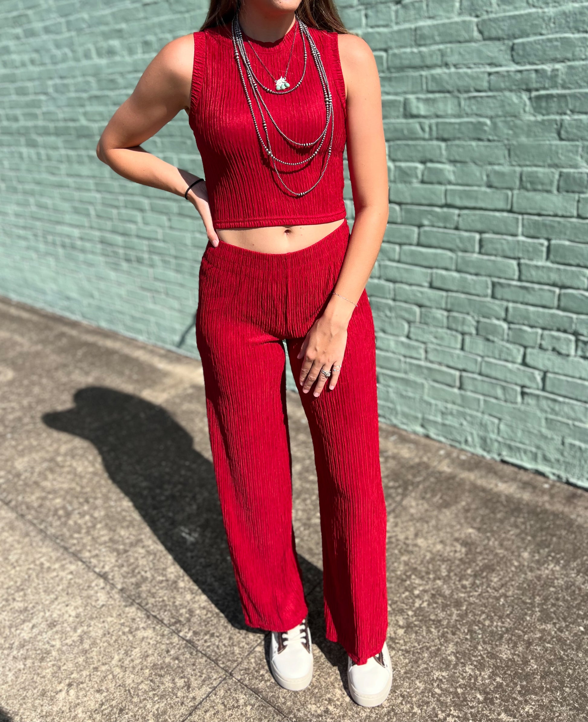 Unleash your inner boss with our Run The Show Set in red. This 2pc loungewear set features a crinkled plisse fabric for a stylish and comfortable look. Perfect for running the show at home or out on the town. Upgrade your loungewear game with this set.