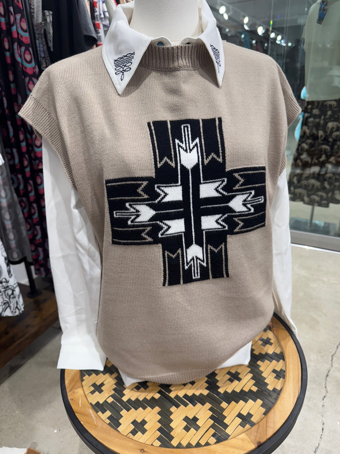 Soft knit pullover sleeveless sweater that can be worn as a top or layered as a vest as shown here. Long sleeve shirt is sold separately. This listing is for the vest only. Runs roomy. 50% Viscose, 28% Polyester, 22% Polyamide
