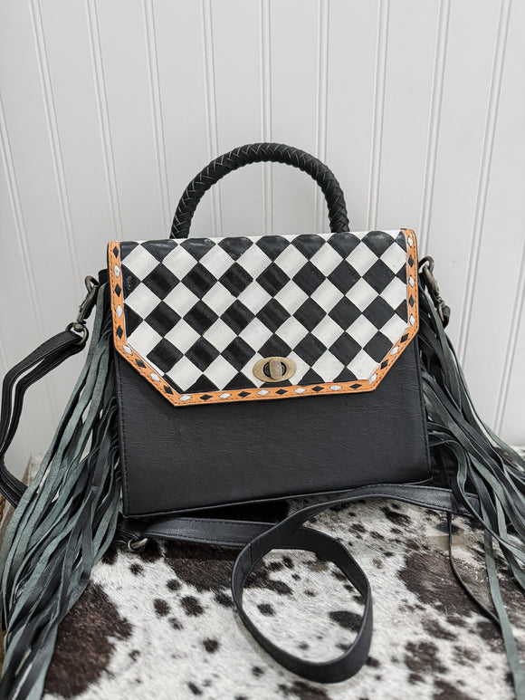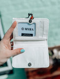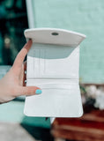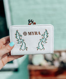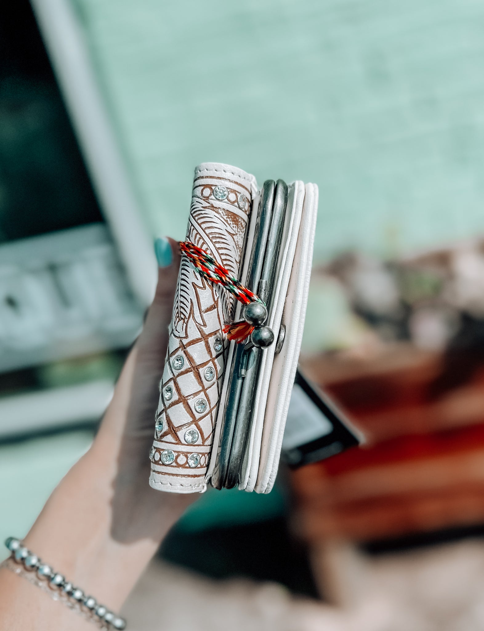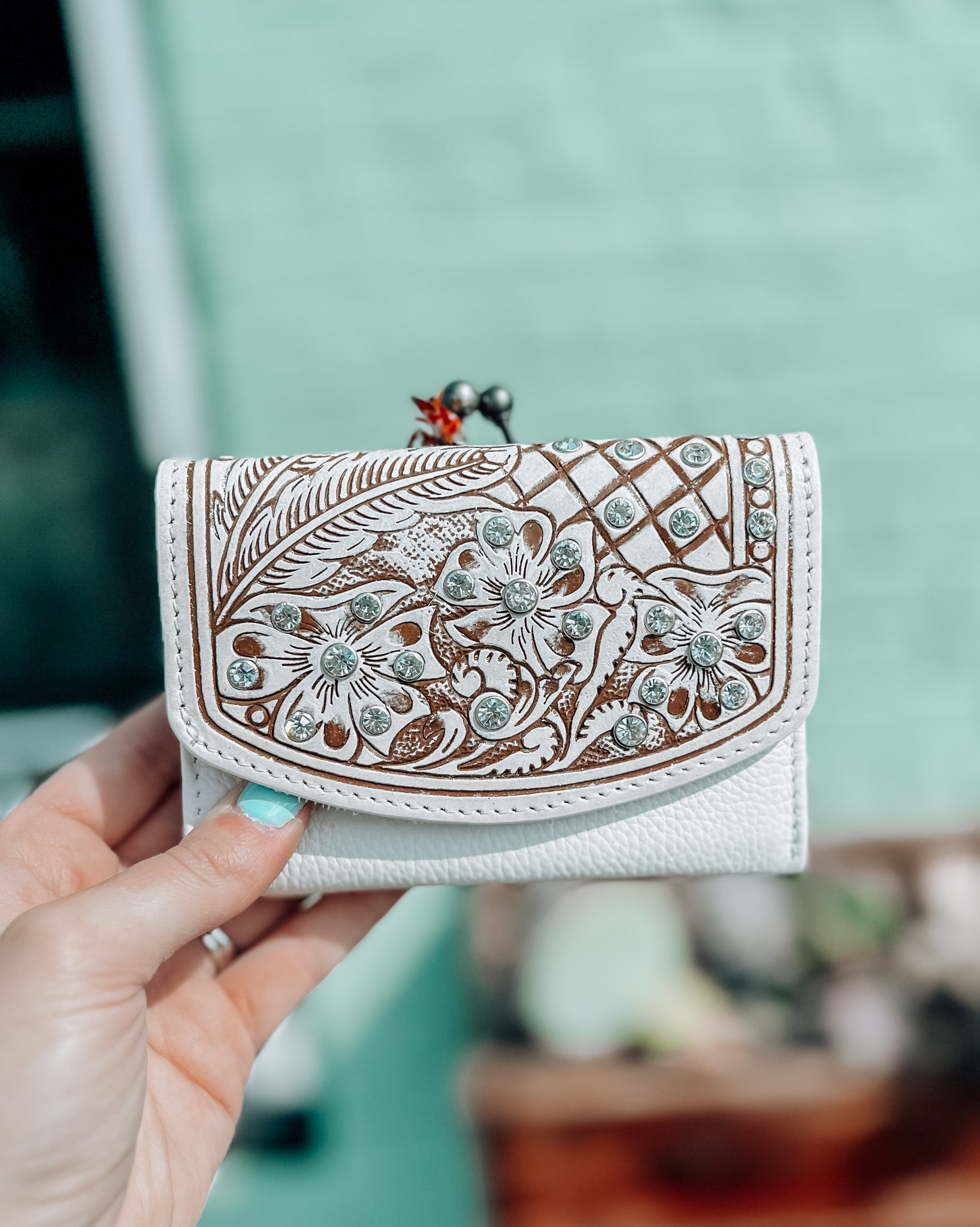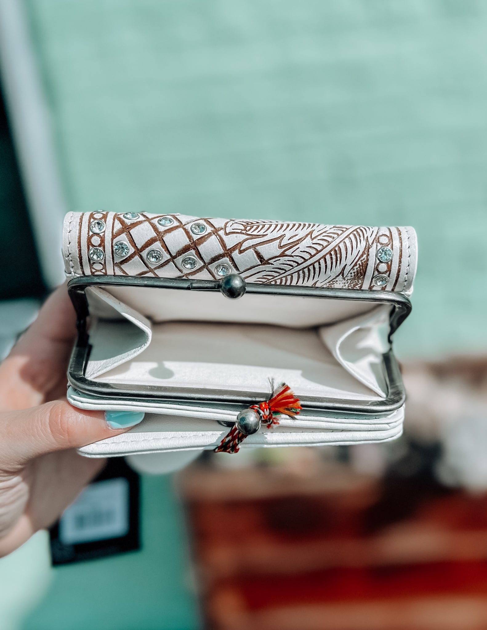 Capture the essence of Western elegance with this dainty treasure, featuring the look of hand-tooled leather adorned with sparkling crystal-studded desert blooms. This petite kiss-lock coin purse showcases delicate feather scrollwork in antique bronze against pearl-white leather. A perfect blend of prairie romance and practical charm for the modern cowgirl.