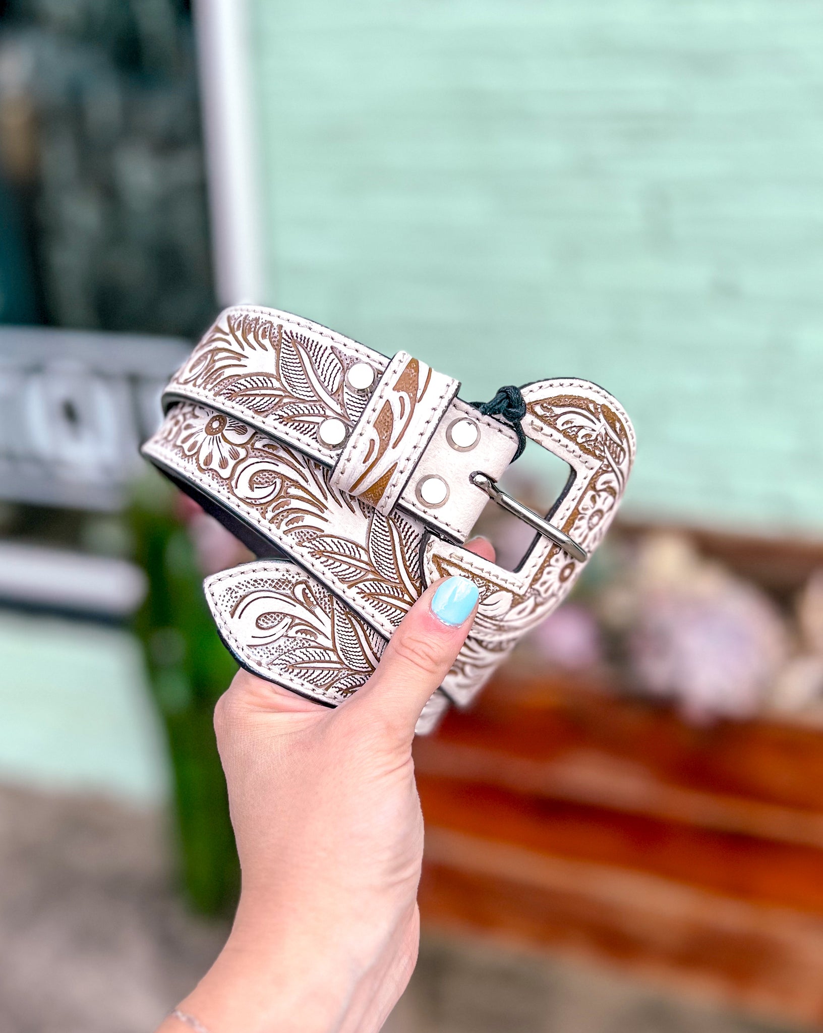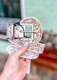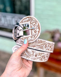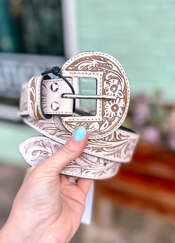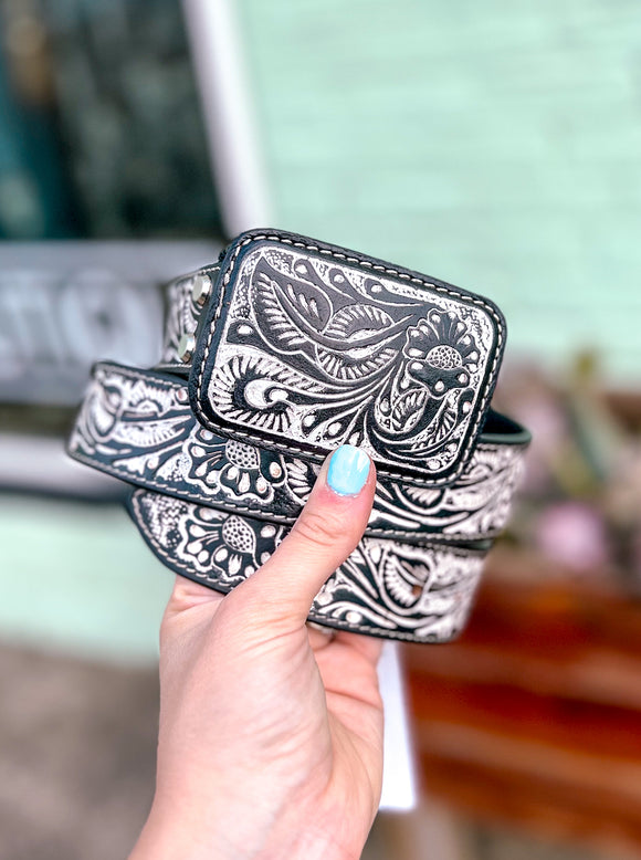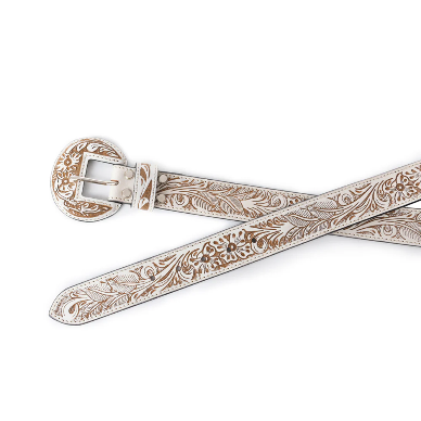 This hand-tooled leather belt showcases intricate floral designs in striking white, creating a statement piece that embodies Southwestern artistry. With its matching buckle and timeless tooling, it adds authentic Western flair to any outfit. Perfect for cowboys and cowgirls alike!