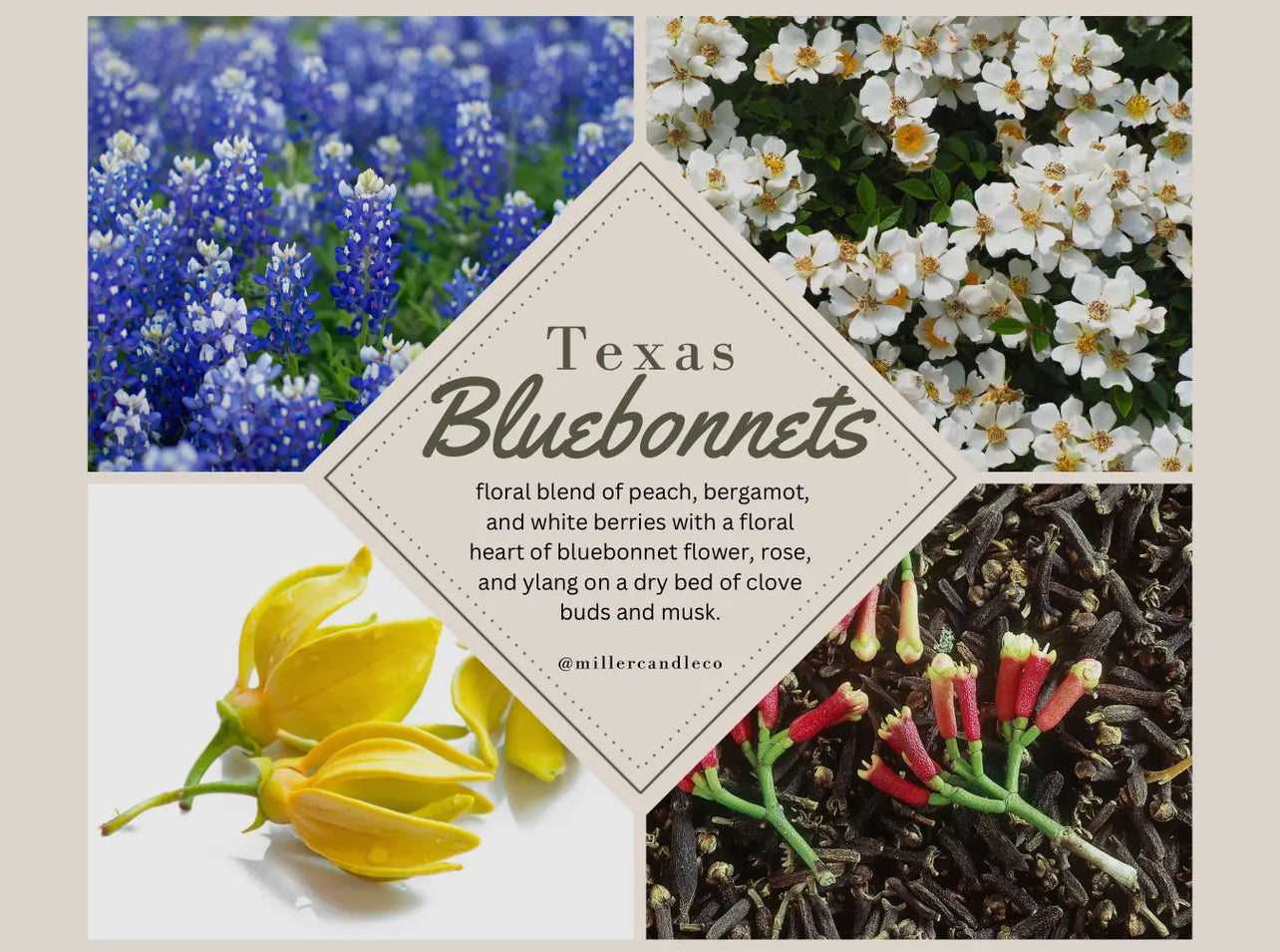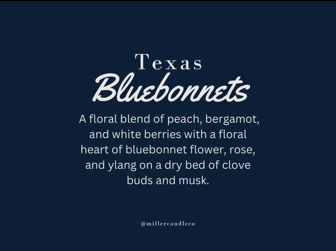 Bright, floral, and unmistakably Texan — Texas Bluebonnets captures the scent of spring across wide-open fields. This fragrance blooms with soft notes of peach, bergamot, and white berries, opening into a floral heart of bluebonnet, rose, and ylang. A warm base of clove buds and musk adds depth, grounding this fresh, floral blend in the quiet beauty of the Texas countryside.