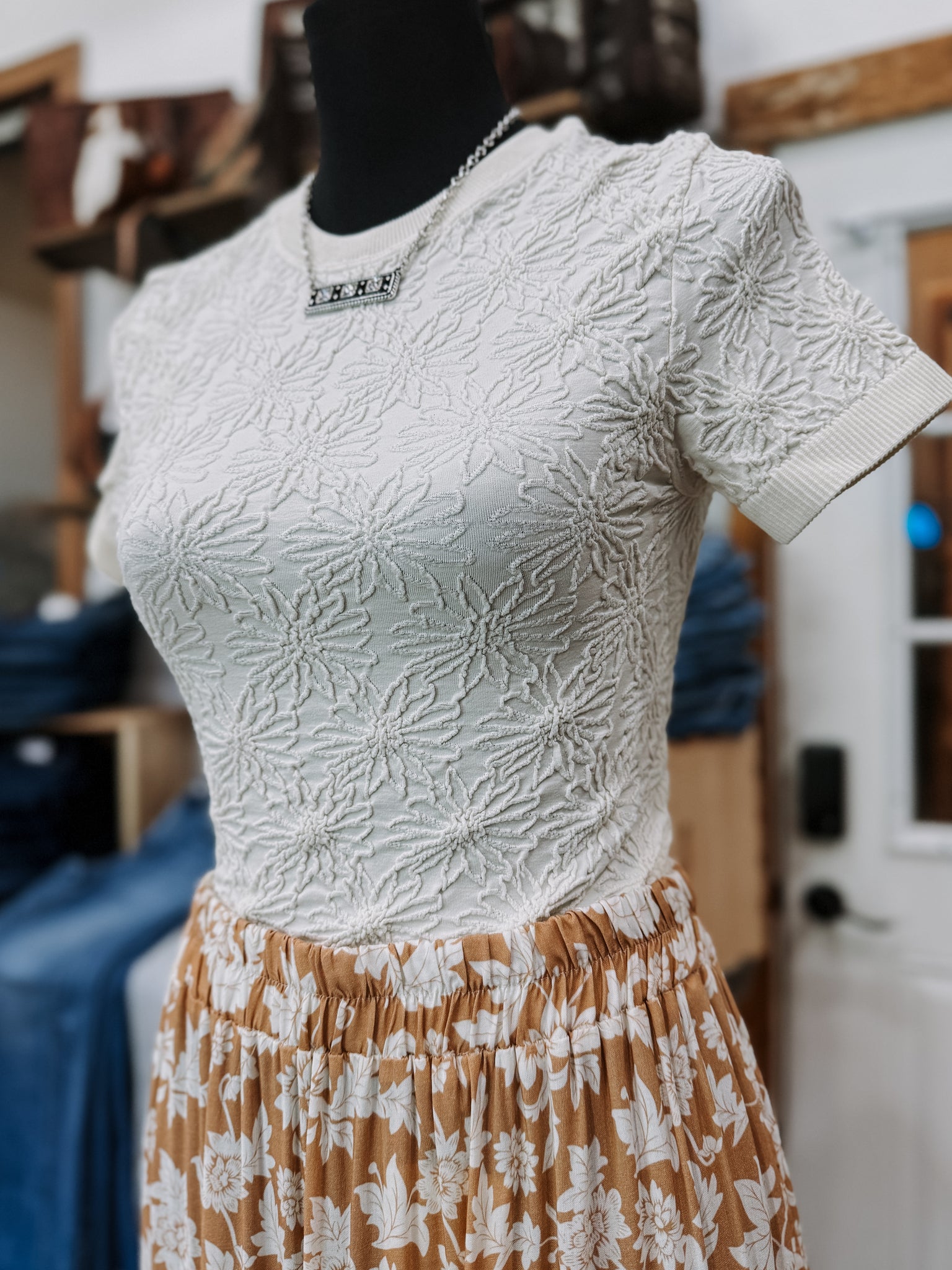 Introducing the Brandy Floral Top - the perfect combination of comfort and style. Made with seamless construction and short sleeves, this ivory top is adorned with a beautiful floral design. Stay stylish and comfortable all day long. (Floral and comfortable? That's what we call top-notch!)
