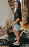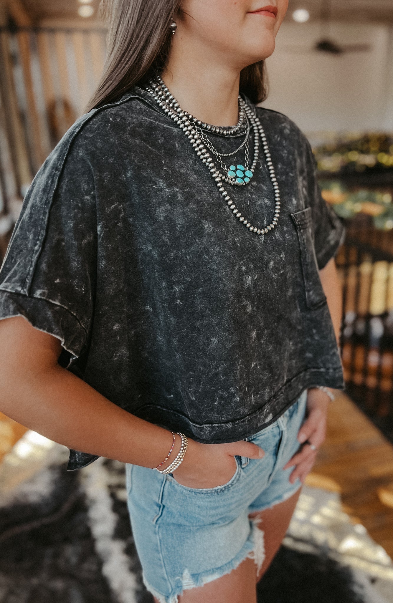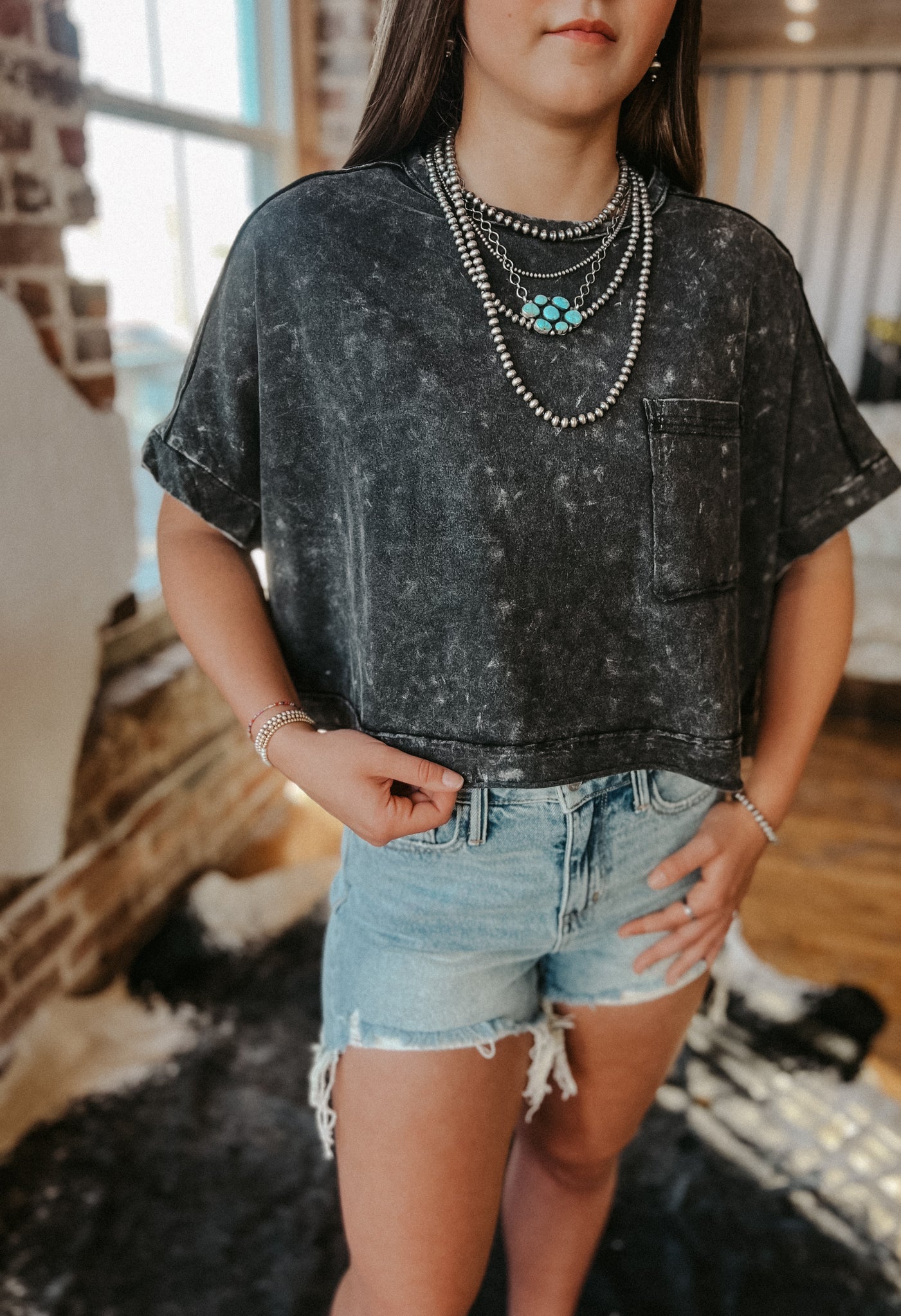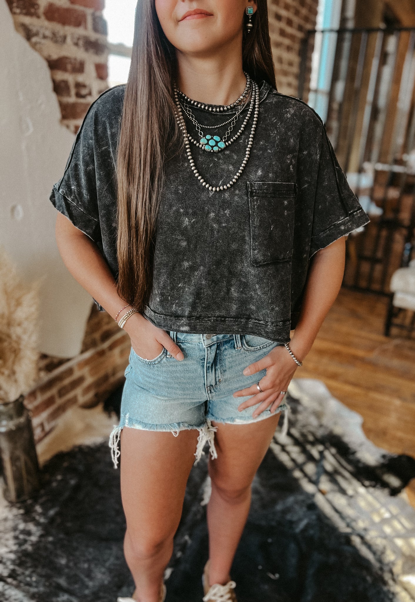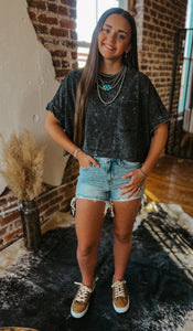 The Brynn Oversized Crop *Aqua Blue is the perfect blend of comfort and style. Made with a mineral wash, this pocket tee fits loosely and hits at the perfect length. Say goodbye to boring t-shirts and hello to a unique and playful addition to your wardrobe.