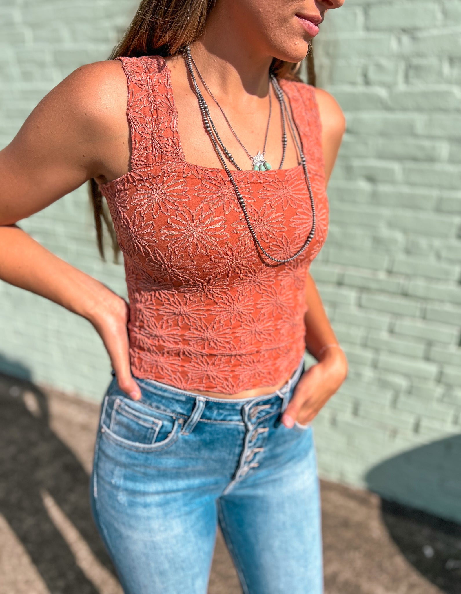 Stay stylish and comfortable with the Caeley Floral Jacquard Tank. The 2 tone floral jacquard design adds a touch of elegance, while the seamless construction ensures a smooth and flattering fit. Perfect for any occasion, this tank top in rust is a must-have addition to your wardrobe.