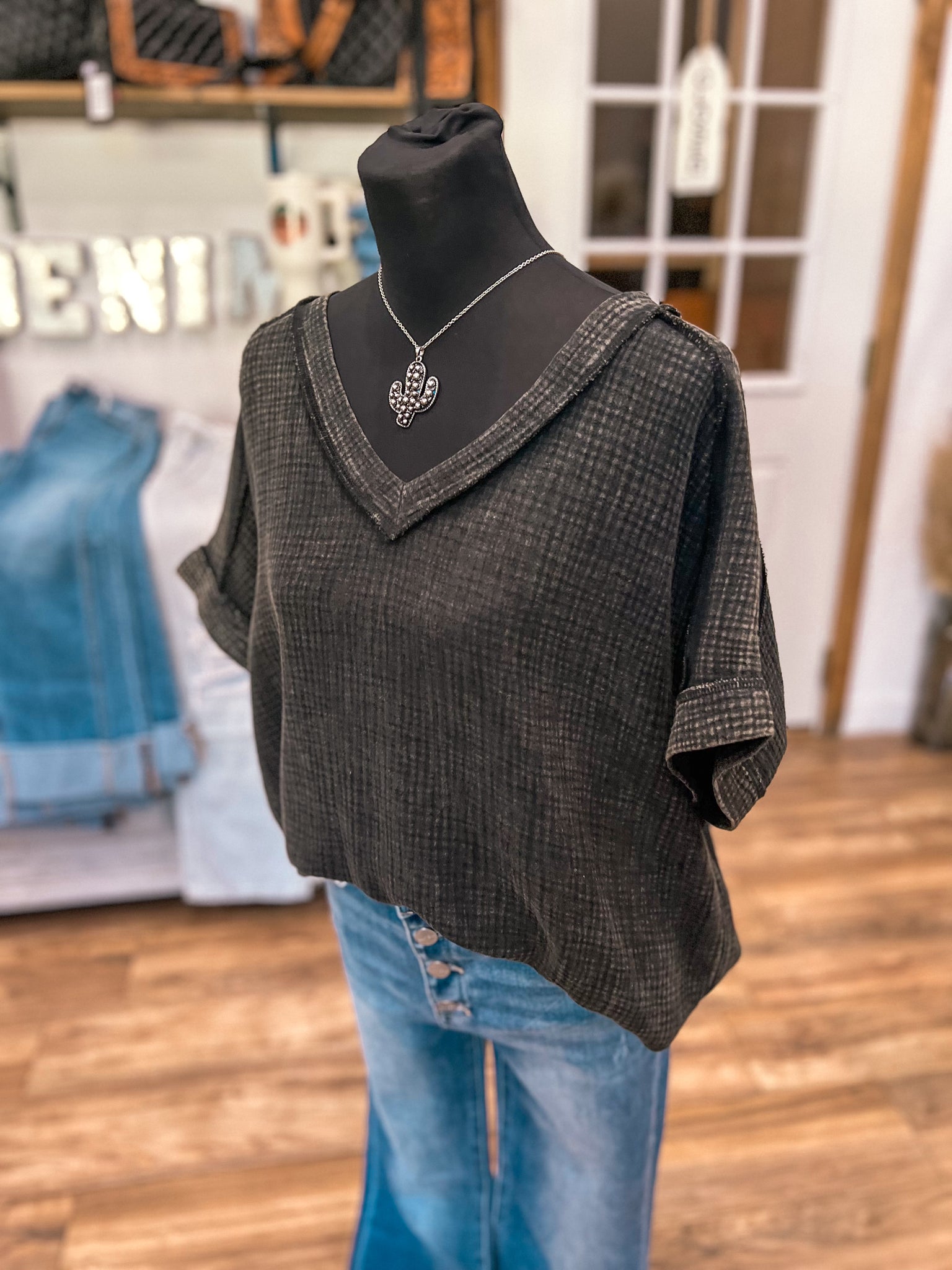 The Jaylee Top: Your go-to black top with a twist! The distressed detailing and v-neck add a touch of edge to this basic piece. It's perfect for creating a versatile and stylish wardrobe. (No boring basics here!)