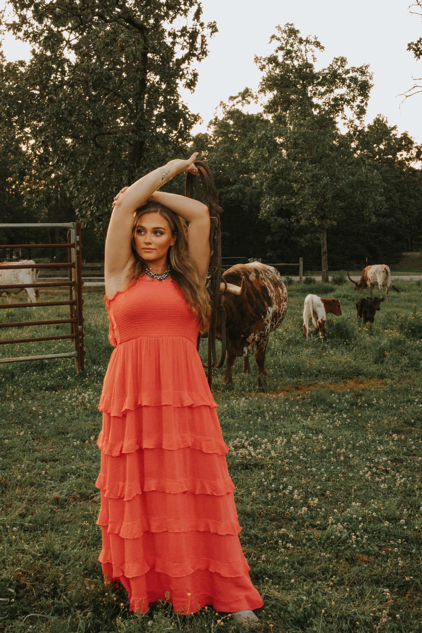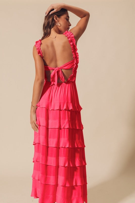 Get ready to turn heads in The Lahela Ruffle Dress! This smocked maxi dress features playful ruffle tiers, an open back, and a charming bow ribbon detail. Perfect for a summer day out or a special occasion.