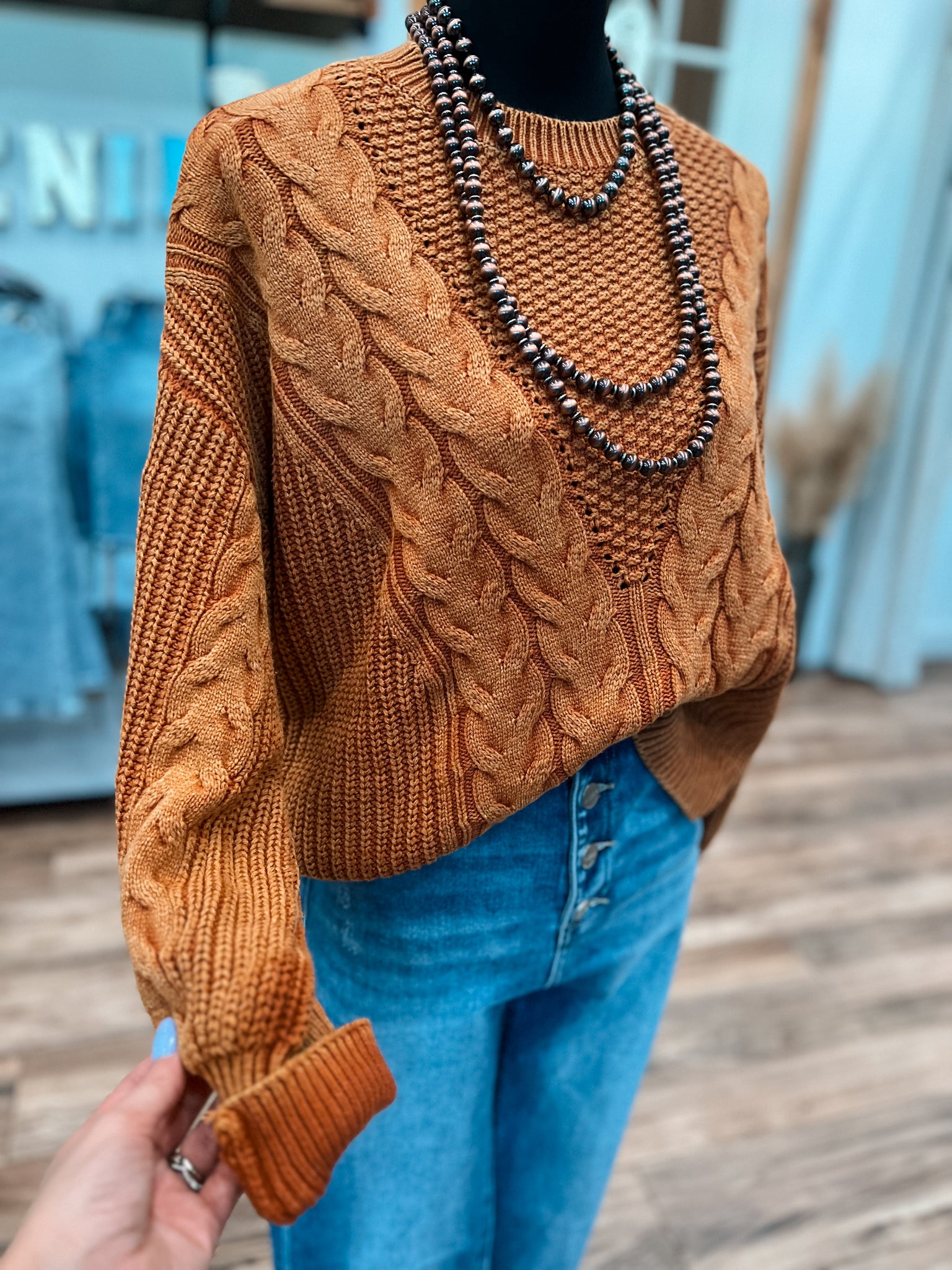 "The Rusty Sweater will add a touch of quirk to your wardrobe. This loose fit sweater features a unique mineral wash and textured cable knit design. Stay cozy and stylish all winter long!"
