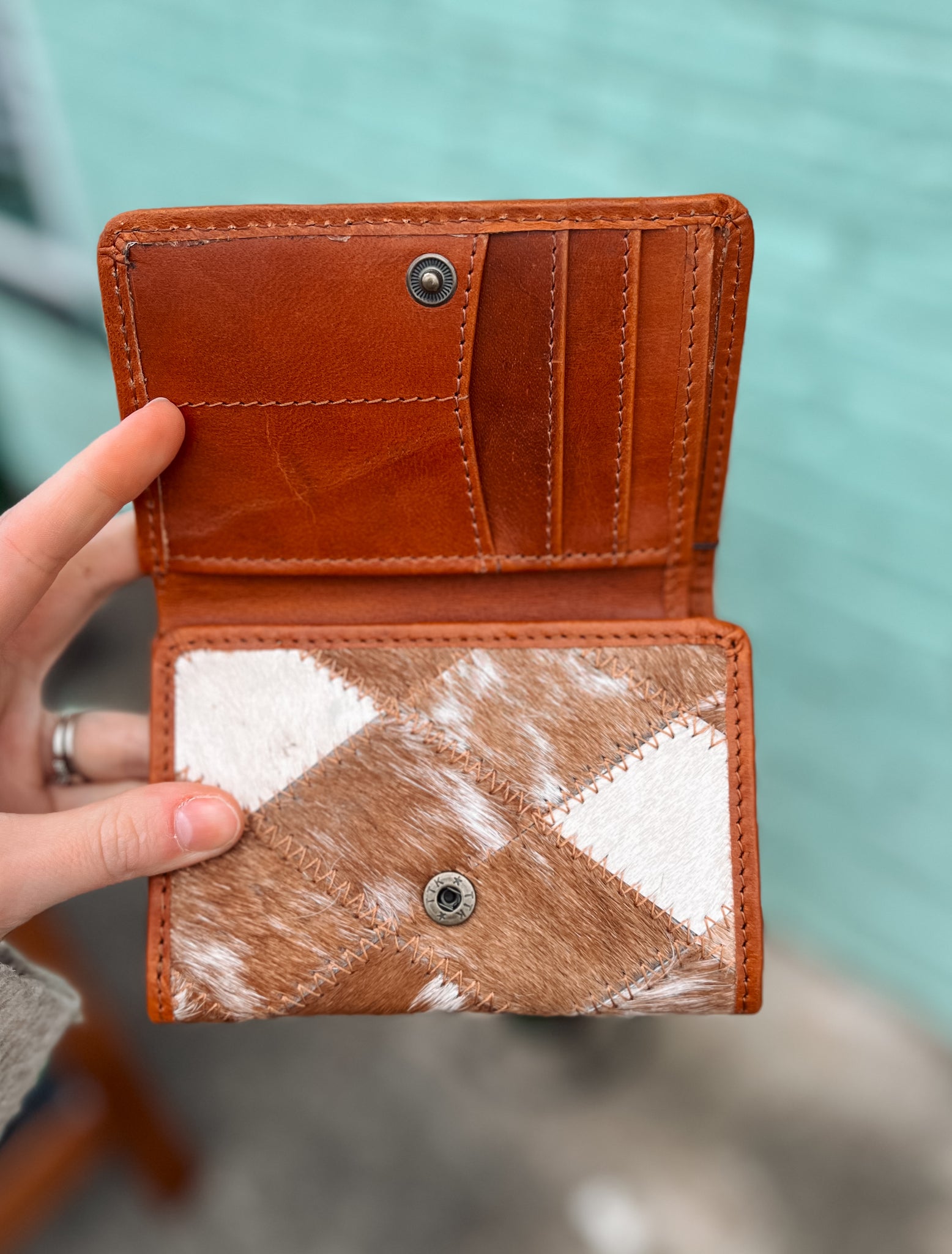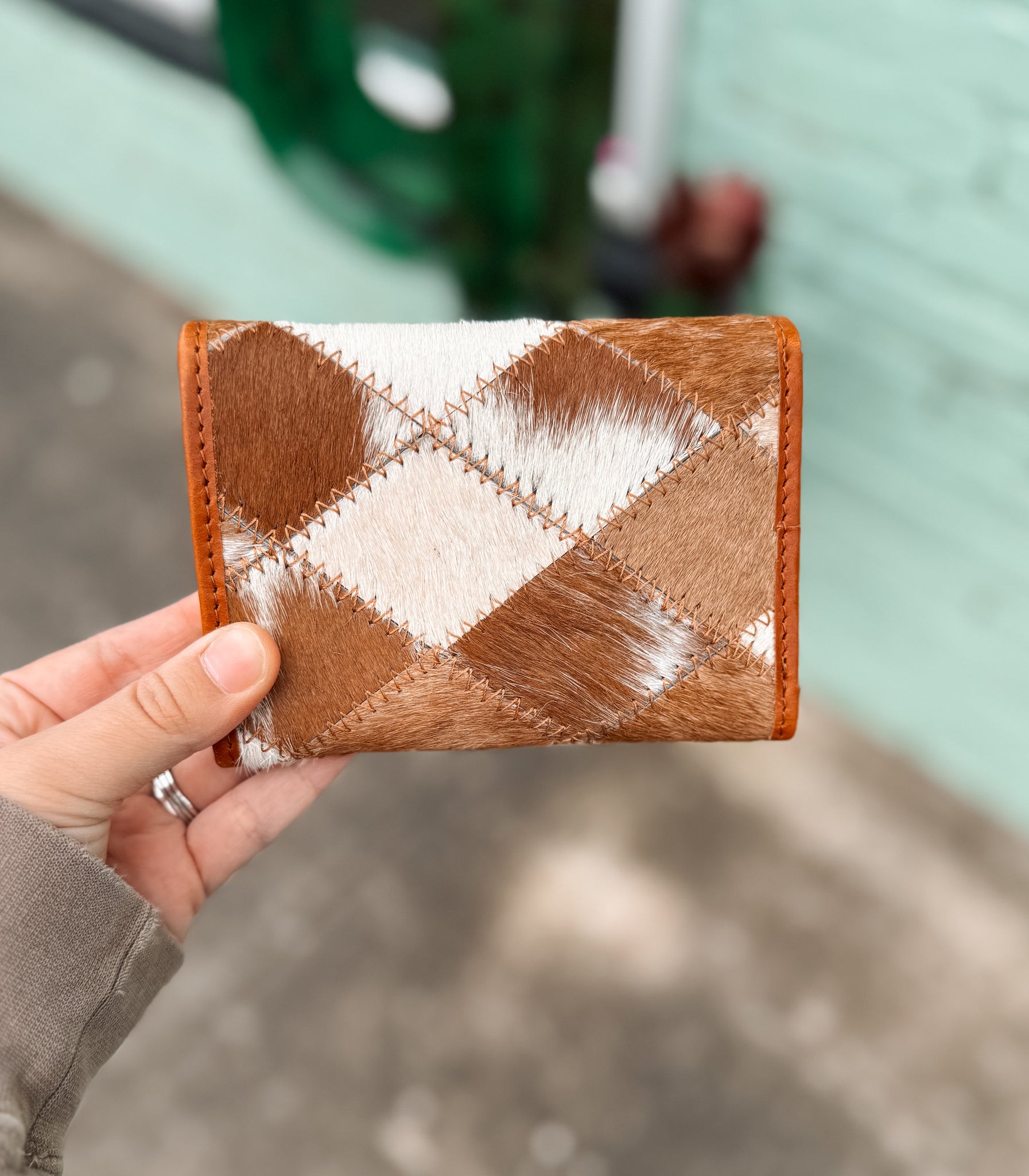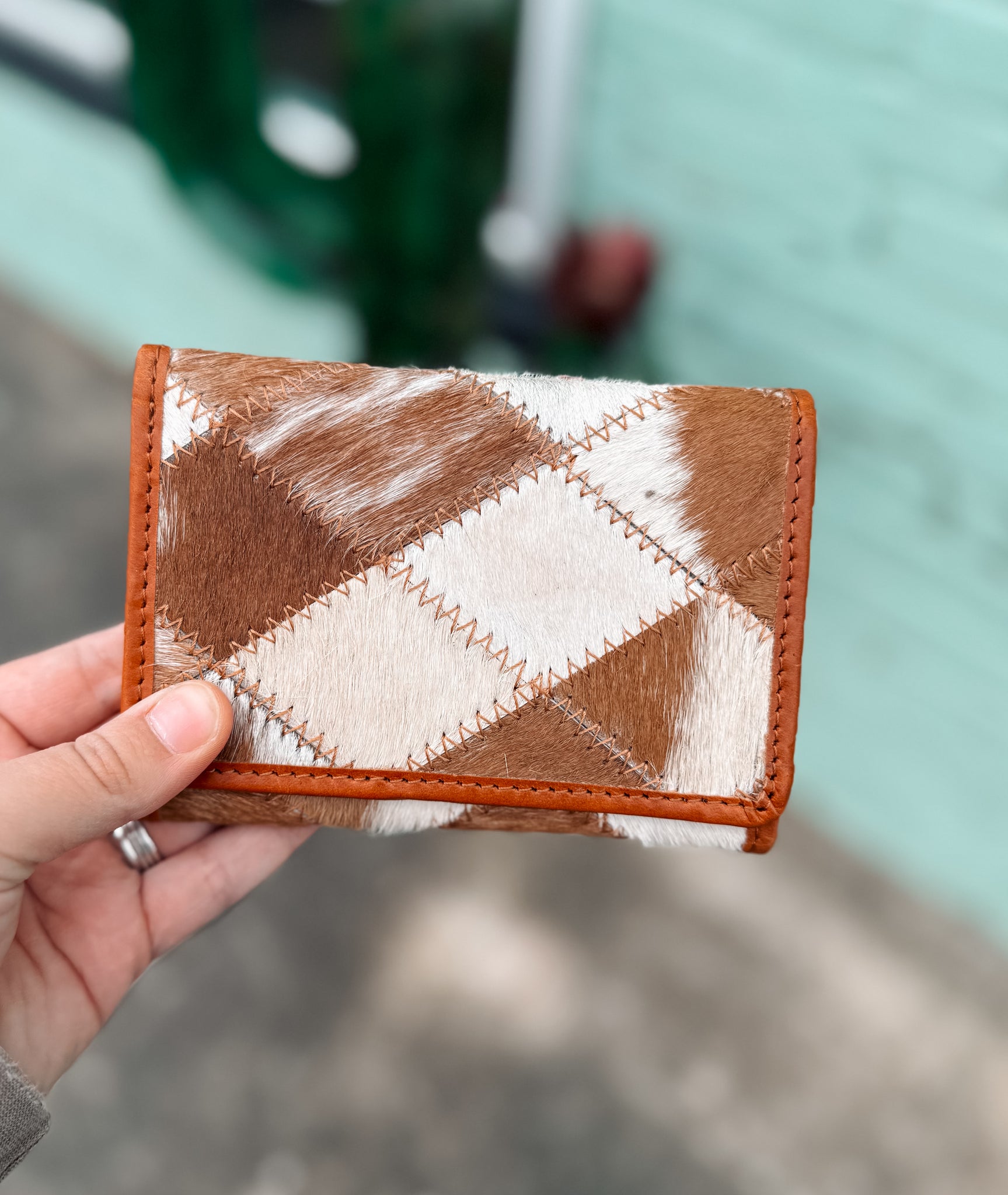 This cowhide diamond pattern trifold wallet is the real deal. Made from authentic cowhide, it's sleek, stylish, and spacious enough to hold all your cards and cash with ease. Say goodbye to boring wallets and hello to this uniquely designed Tess Wallet in brown.