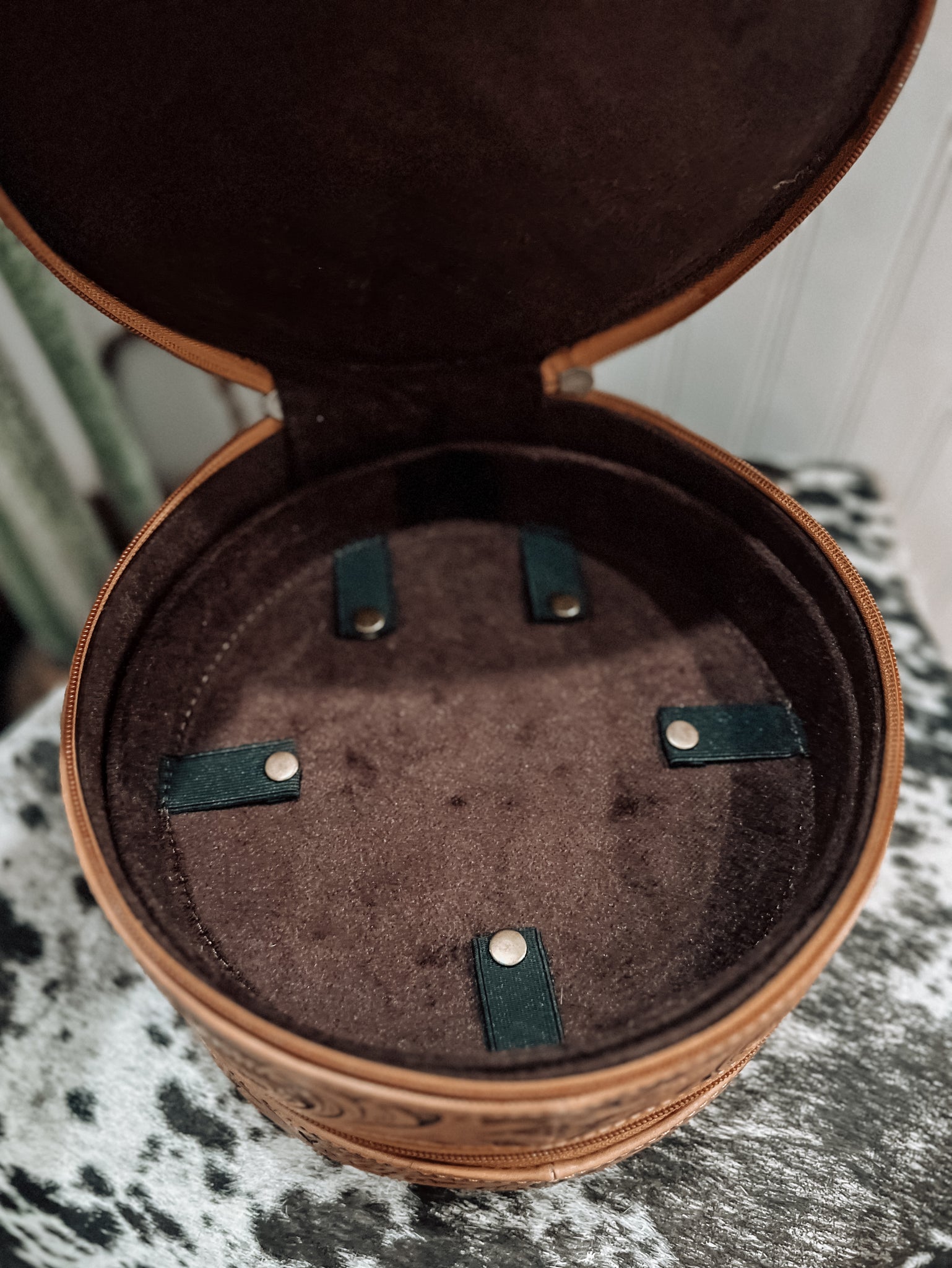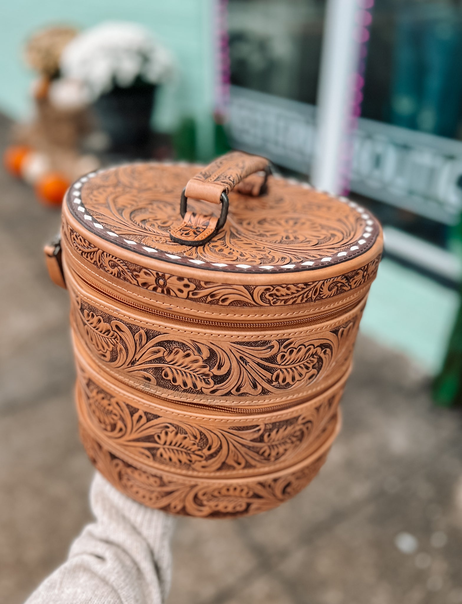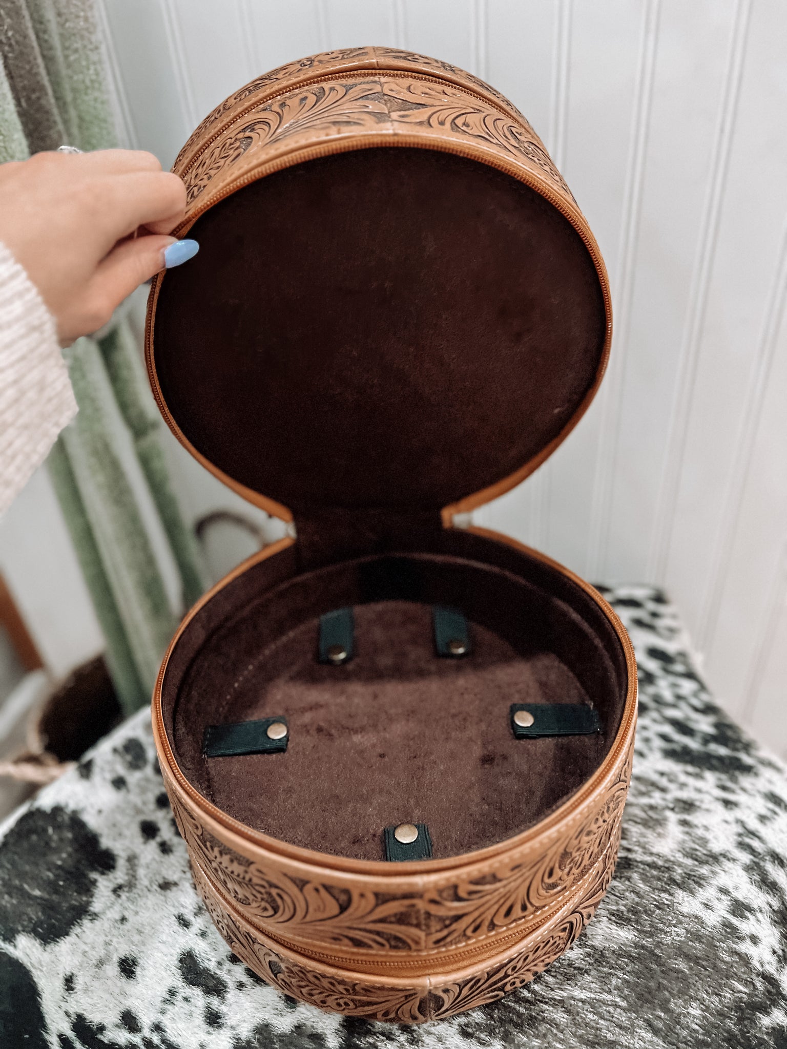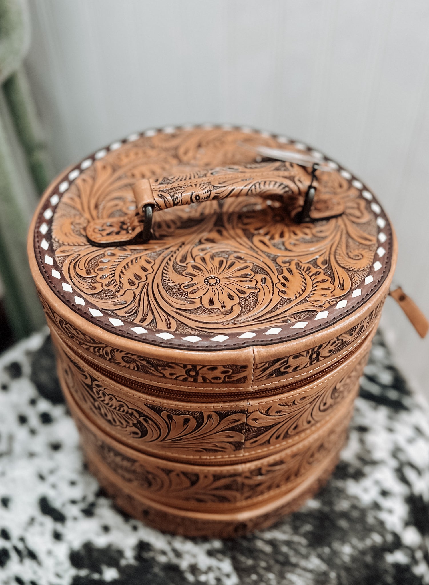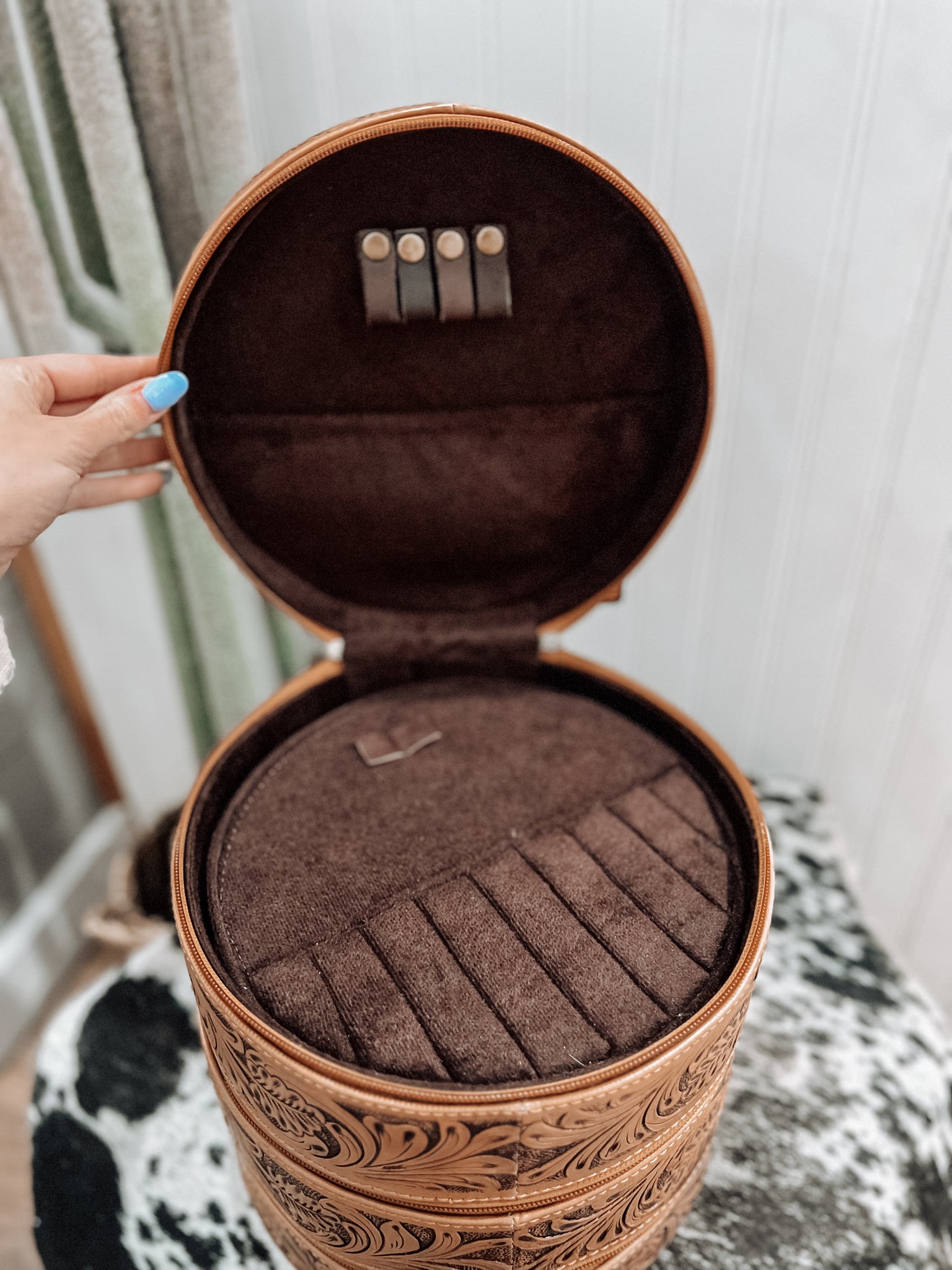 Experience the ultimate convenience and style with our Triple Threat Round Travel Jewelry Case! Crafted from authentic tooled leather, this case features three tiers and a carry handle for effortless travel. Easily access your jewelry with the removable trays. Elevate your travel experience and protect your precious accessories with this must-have case!