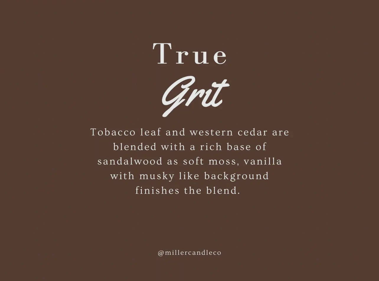 Miller Candle Co. True Grit 100% Soy Wax Melts. Tobacco leaf and western cedar are blended with a rich base of sandalwood as soft moss, vanilla with musky like background finishes the blend.