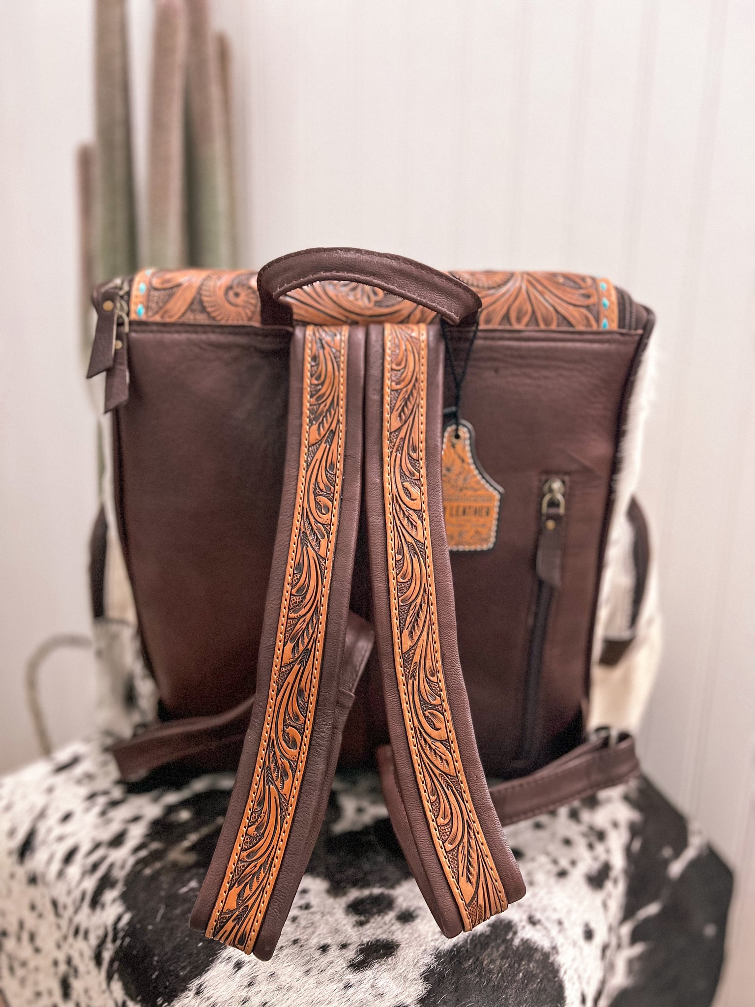 Elevate your style with our beautiful Turquoise Mama Tooled Cowhide Backpack. Handcrafted with tooled leather and luxurious cowhide, this versatile bag serves as both a stylish backpack and functional diaper bag. Embrace the perfect combination of fashion and function with our exquisite design!