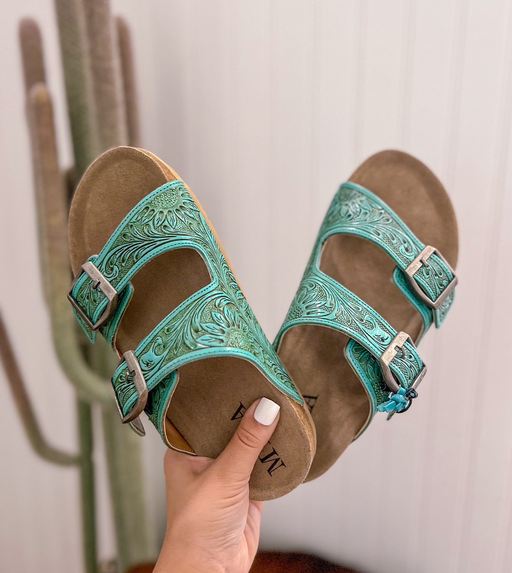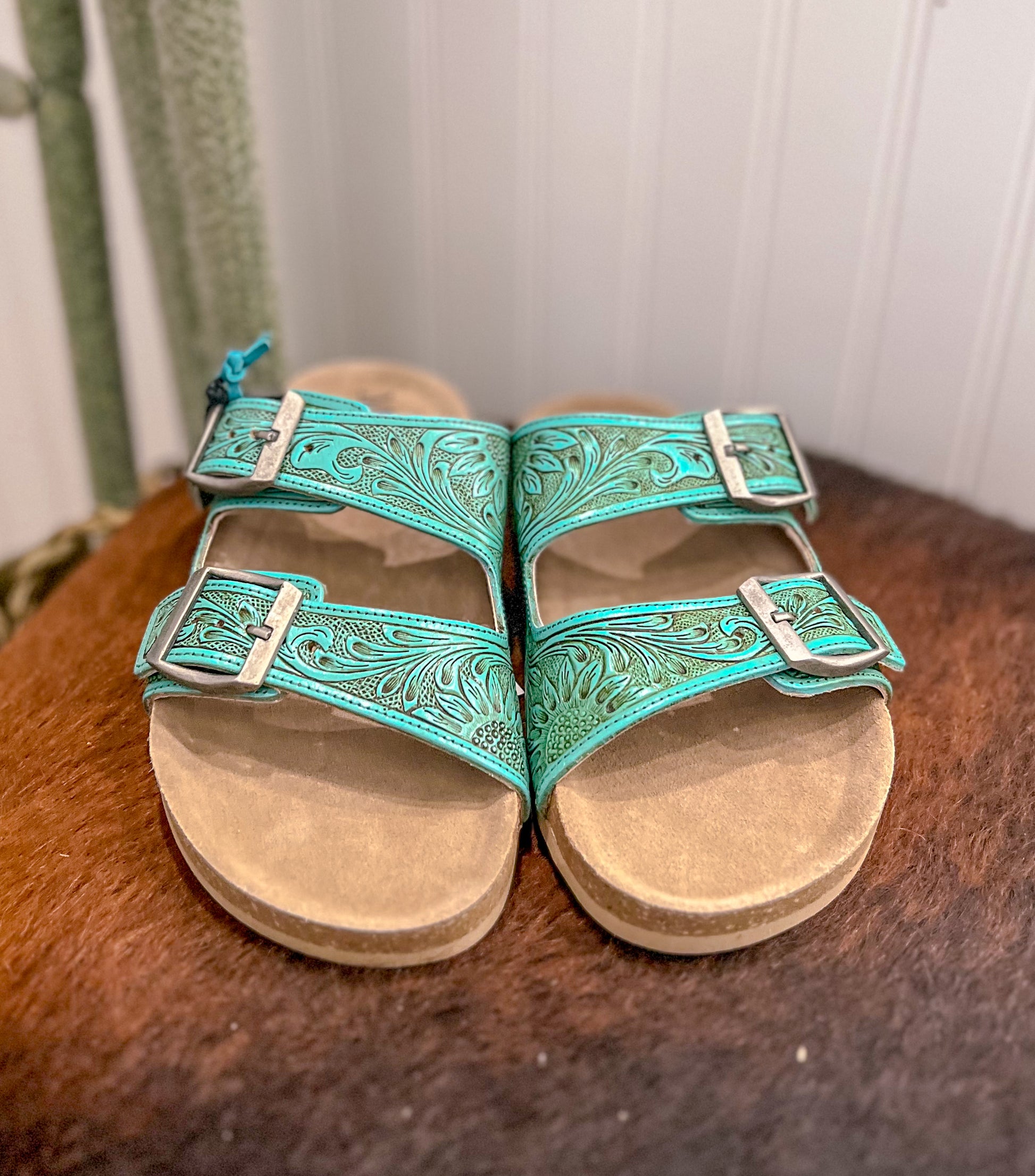 Experience the perfect blend of style and comfort with our Turquoise Tooled Sandals. Crafted from high-quality turquoise tooled leather, these sandals not only make a fashion statement, but also provide the utmost comfort for your feet. Ideal for all-day wear, these sandals are a must-have for any fashion-forward individual.