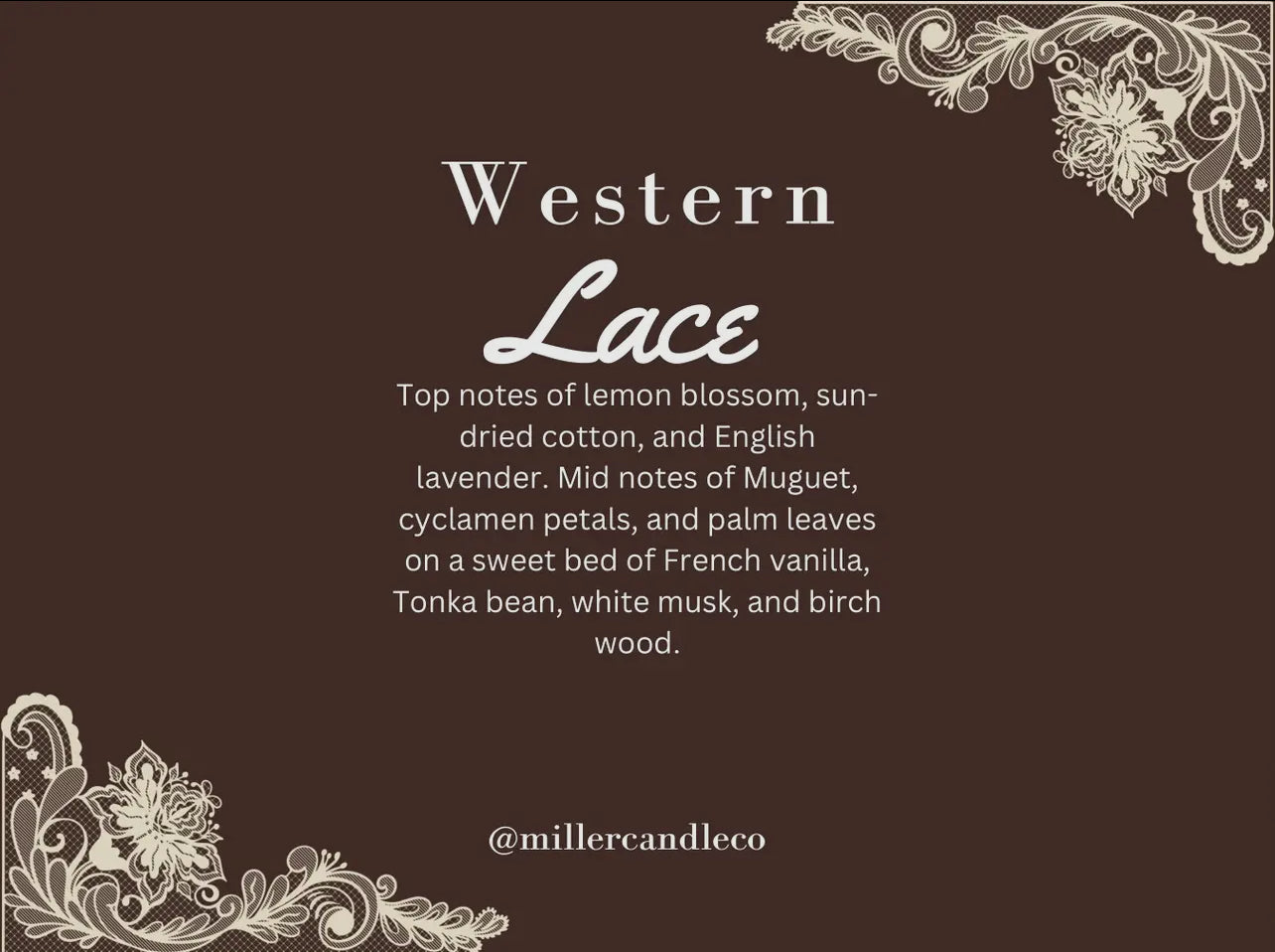 Miller Candle Co. Western Lace 100% Soy Wax Melts. Top notes of lemon blossom, sun-dried cotton, and English lavender. Mid notes of Muguet, cyclamen petals, and palm leaves on a sweet bed of French vanilla. Bottom notes of Tonka bean, white musk, and birch wood.