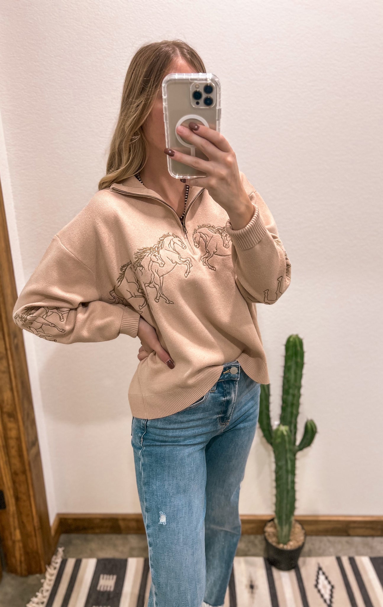 "Giddy up in style with our Wild Horses Quarter-Zip! This cozy sweater features an embroidered horses graphic and a quarter zip design for easy wear. Take your wardrobe to the wild side and stay warm all day long. No horsing around, this sweater is a must-have!"