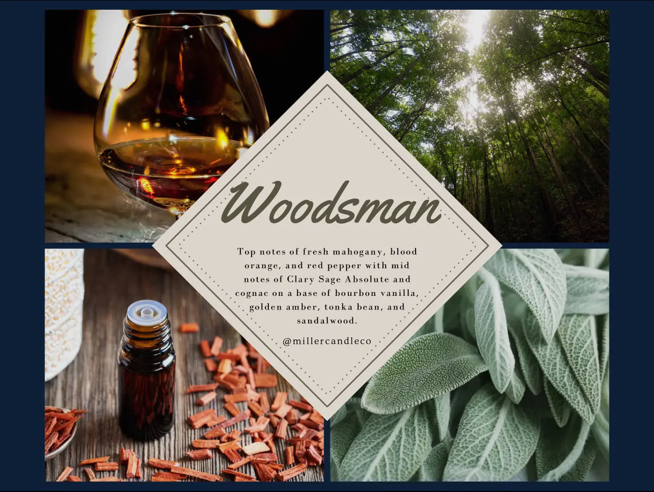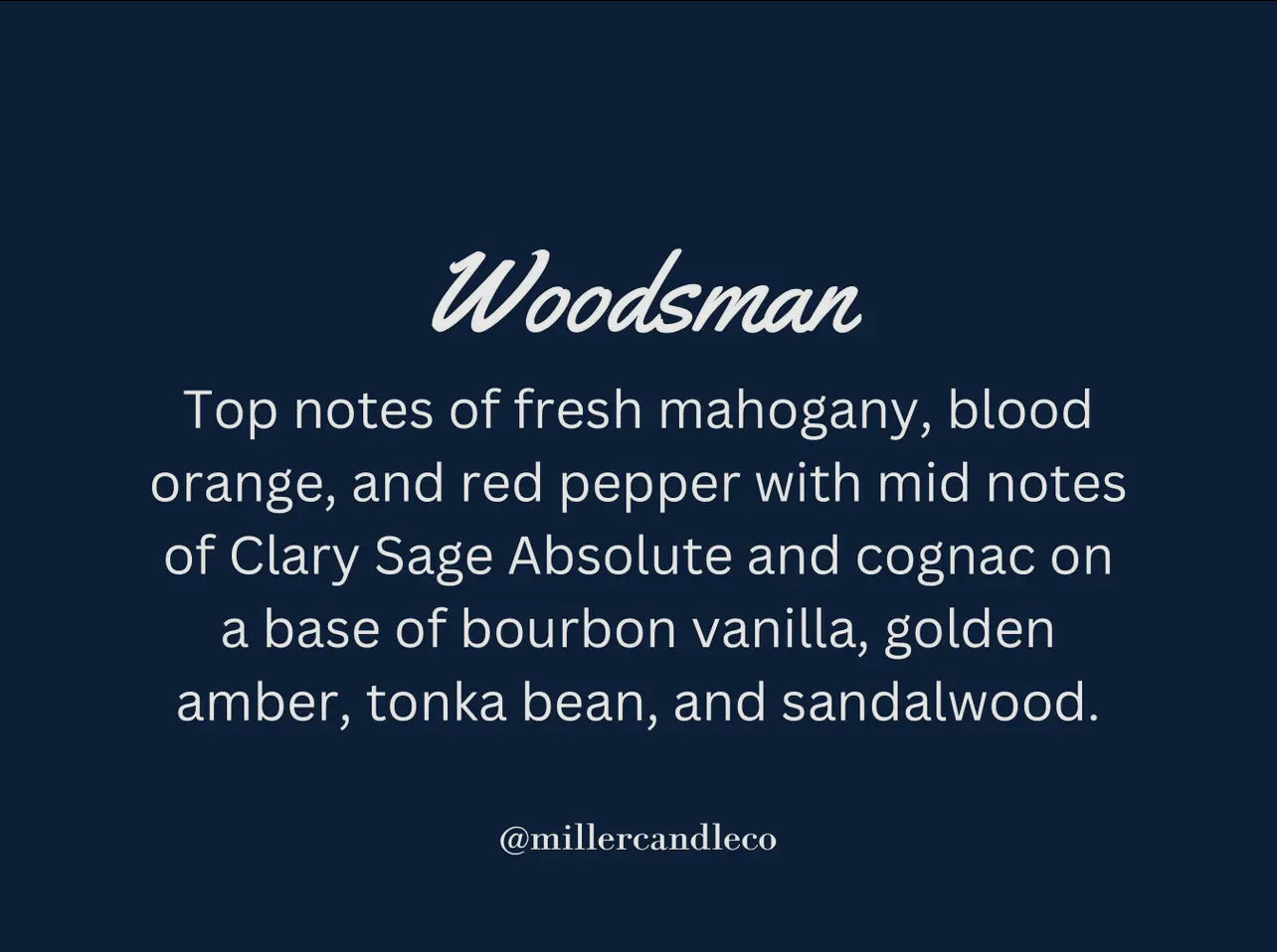Strong, refined, and timeless - Woodsman captures the rugged charm of the great outdoors and the quiet confidence of a true gentleman. Fresh mahogany and blood orange mingle with hints of red pepper and Clary Sage Absolute, layered over a smooth base of bourbon vanilla, amber, tonka bean, and sandalwood. The result is a bold yet balanced fragrance that feels both grounded and sophisticated - like the scent of wood smoke and worn leather carried on a crisp breeze.